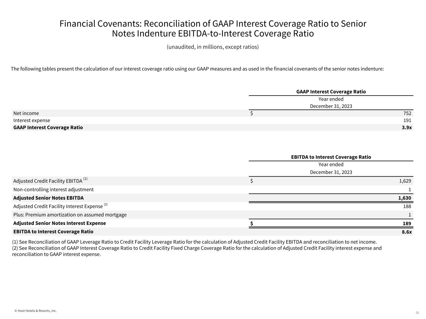 © Host Hotels & Resorts, Inc. Financial Covenants: Reconciliation of GAAP Secured Indebtedness Test to Senior Notes Indenture Secured Indebtedness Test 34 (unaudited, in millions, except ratios) The following table presents the calculation of our secured indebtedness using GAAP measures and as used in the financial covenants of our senior notes indenture: (2) See Reconciliation of GAAP Indebtedness Test to Senior Notes Indenture Indebtedness Test for reconciliation of GAAP Total Assets to Adjusted Total Assets per our senior notes indenture. (1) The following presents the reconciliation of mortgage debt to secured indebtedness per the financial covenants of our senior notes indenture definition: GAAP Secured Indebtedness December 31, 2023 Mortgage and other secured debt $ 100 Total assets 12,243 GAAP Secured Indebtedness to Total Assets <1% Secured Indebtedness per Senior Notes Indenture December 31, 2023 Secured indebtedness (1) $ 98 Adjusted total assets (2) 20,882 Secured Indebtedness to Total Assets <1% December 31, 2023 Mortgage and other secured debt $ 100 Less: Mark-to-market on assumed mortgage (2) Secured Indebtedness $ 98