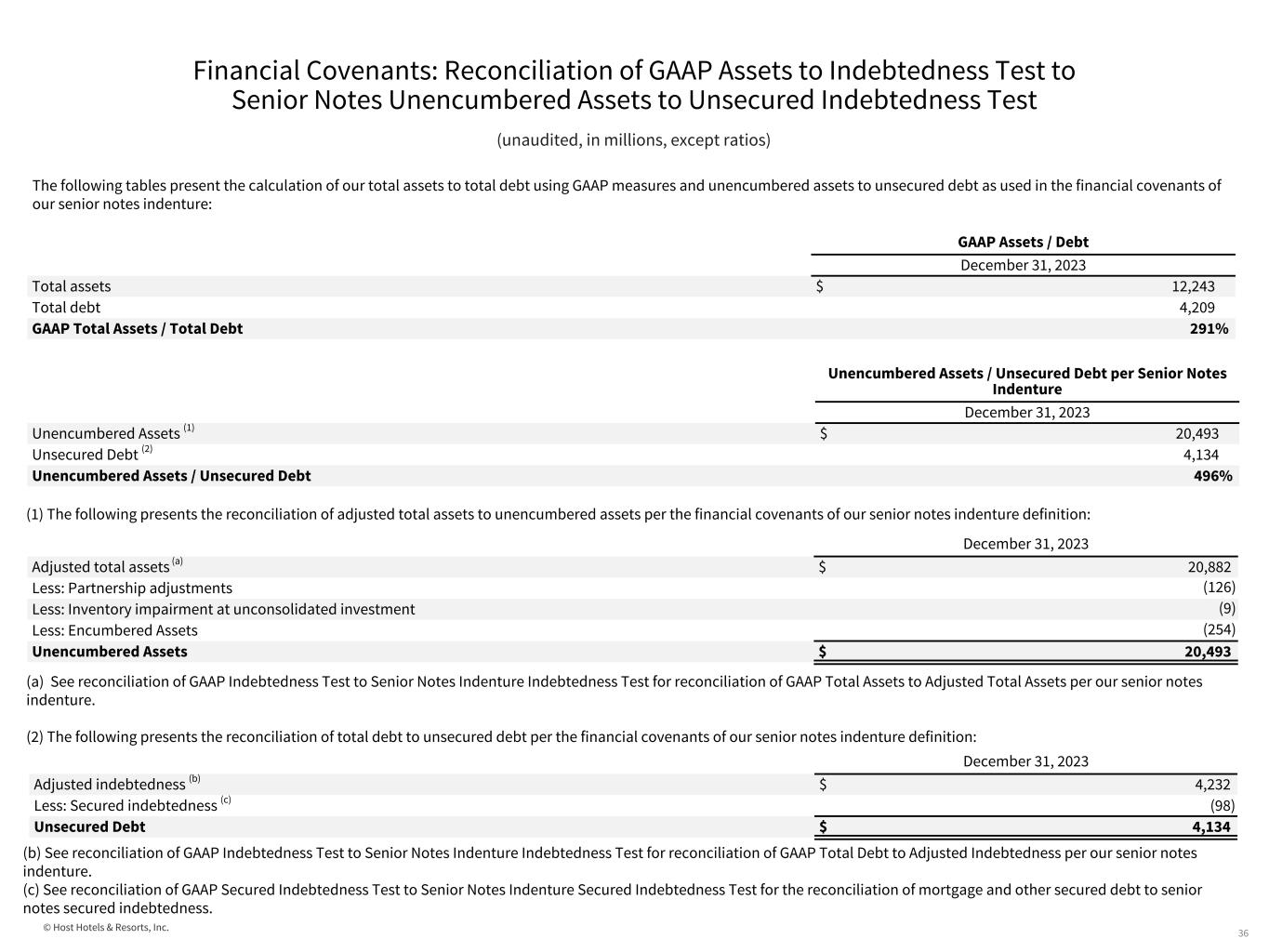 © Host Hotels & Resorts, Inc. Financial Covenants: Reconciliation of GAAP Assets to Indebtedness Test to Senior Notes Unencumbered Assets to Unsecured Indebtedness Test 36 (unaudited, in millions, except ratios) The following tables present the calculation of our total assets to total debt using GAAP measures and unencumbered assets to unsecured debt as used in the financial covenants of our senior notes indenture: (1) The following presents the reconciliation of adjusted total assets to unencumbered assets per the financial covenants of our senior notes indenture definition: (a) See reconciliation of GAAP Indebtedness Test to Senior Notes Indenture Indebtedness Test for reconciliation of GAAP Total Assets to Adjusted Total Assets per our senior notes indenture. (2) The following presents the reconciliation of total debt to unsecured debt per the financial covenants of our senior notes indenture definition: (b) See reconciliation of GAAP Indebtedness Test to Senior Notes Indenture Indebtedness Test for reconciliation of GAAP Total Debt to Adjusted Indebtedness per our senior notes indenture. (c) See reconciliation of GAAP Secured Indebtedness Test to Senior Notes Indenture Secured Indebtedness Test for the reconciliation of mortgage and other secured debt to senior notes secured indebtedness. GAAP Assets / Debt December 31, 2023 Total assets $ 12,243 Total debt 4,209 GAAP Total Assets / Total Debt 291% Unencumbered Assets / Unsecured Debt per Senior Notes Indenture December 31, 2023 Unencumbered Assets (1) $ 20,493 Unsecured Debt (2) 4,134 Unencumbered Assets / Unsecured Debt 496% December 31, 2023 Adjusted total assets (a) $ 20,882 Less: Partnership adjustments (126) Less: Inventory impairment at unconsolidated investment (9) Less: Encumbered Assets (254) Unencumbered Assets $ 20,493 December 31, 2023 Adjusted indebtedness (b) $ 4,232 Less: Secured indebtedness (c) (98) Unsecured Debt $ 4,134