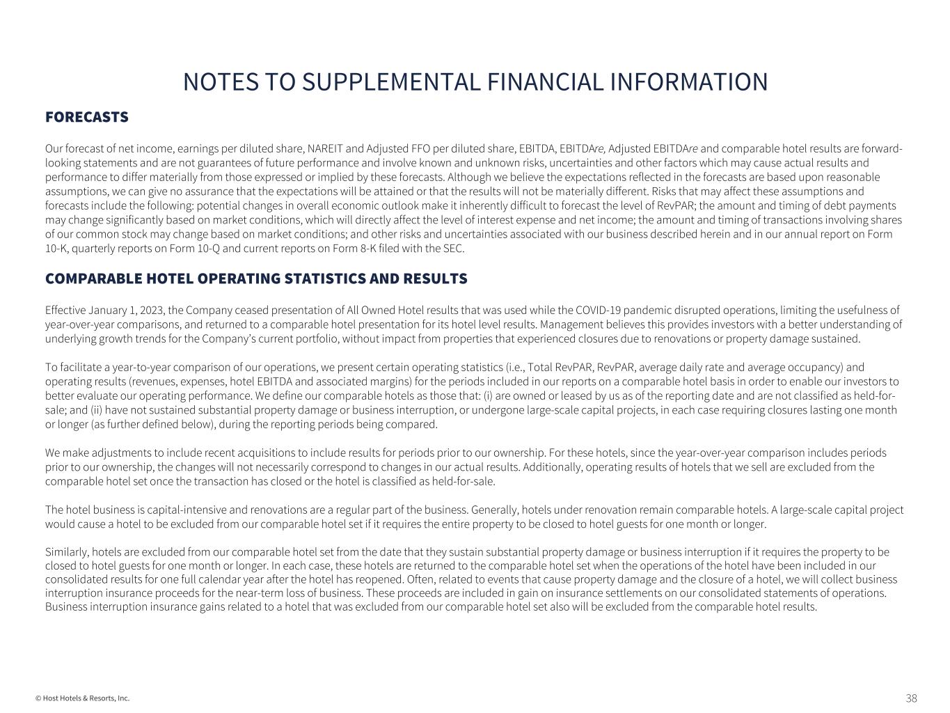 38© Host Hotels & Resorts, Inc. FORECASTS Our forecast of net income, earnings per diluted share, NAREIT and Adjusted FFO per diluted share, EBITDA, EBITDAre, Adjusted EBITDAre and comparable hotel results are forward- looking statements and are not guarantees of future performance and involve known and unknown risks, uncertainties and other factors which may cause actual results and performance to differ materially from those expressed or implied by these forecasts. Although we believe the expectations reflected in the forecasts are based upon reasonable assumptions, we can give no assurance that the expectations will be attained or that the results will not be materially different. Risks that may affect these assumptions and forecasts include the following: potential changes in overall economic outlook make it inherently difficult to forecast the level of RevPAR; the amount and timing of debt payments may change significantly based on market conditions, which will directly affect the level of interest expense and net income; the amount and timing of transactions involving shares of our common stock may change based on market conditions; and other risks and uncertainties associated with our business described herein and in our annual report on Form 10-K, quarterly reports on Form 10-Q and current reports on Form 8-K filed with the SEC. COMPARABLE HOTEL OPERATING STATISTICS AND RESULTS Effective January 1, 2023, the Company ceased presentation of All Owned Hotel results that was used while the COVID-19 pandemic disrupted operations, limiting the usefulness of year-over-year comparisons, and returned to a comparable hotel presentation for its hotel level results. Management believes this provides investors with a better understanding of underlying growth trends for the Company’s current portfolio, without impact from properties that experienced closures due to renovations or property damage sustained. To facilitate a year-to-year comparison of our operations, we present certain operating statistics (i.e., Total RevPAR, RevPAR, average daily rate and average occupancy) and operating results (revenues, expenses, hotel EBITDA and associated margins) for the periods included in our reports on a comparable hotel basis in order to enable our investors to better evaluate our operating performance. We define our comparable hotels as those that: (i) are owned or leased by us as of the reporting date and are not classified as held-for- sale; and (ii) have not sustained substantial property damage or business interruption, or undergone large-scale capital projects, in each case requiring closures lasting one month or longer (as further defined below), during the reporting periods being compared. We make adjustments to include recent acquisitions to include results for periods prior to our ownership. For these hotels, since the year-over-year comparison includes periods prior to our ownership, the changes will not necessarily correspond to changes in our actual results. Additionally, operating results of hotels that we sell are excluded from the comparable hotel set once the transaction has closed or the hotel is classified as held-for-sale. The hotel business is capital-intensive and renovations are a regular part of the business. Generally, hotels under renovation remain comparable hotels. A large-scale capital project would cause a hotel to be excluded from our comparable hotel set if it requires the entire property to be closed to hotel guests for one month or longer. Similarly, hotels are excluded from our comparable hotel set from the date that they sustain substantial property damage or business interruption if it requires the property to be closed to hotel guests for one month or longer. In each case, these hotels are returned to the comparable hotel set when the operations of the hotel have been included in our consolidated results for one full calendar year after the hotel has reopened. Often, related to events that cause property damage and the closure of a hotel, we will collect business interruption insurance proceeds for the near-term loss of business. These proceeds are included in gain on insurance settlements on our consolidated statements of operations. Business interruption insurance gains related to a hotel that was excluded from our comparable hotel set also will be excluded from the comparable hotel results. NOTES TO SUPPLEMENTAL FINANCIAL INFORMATION