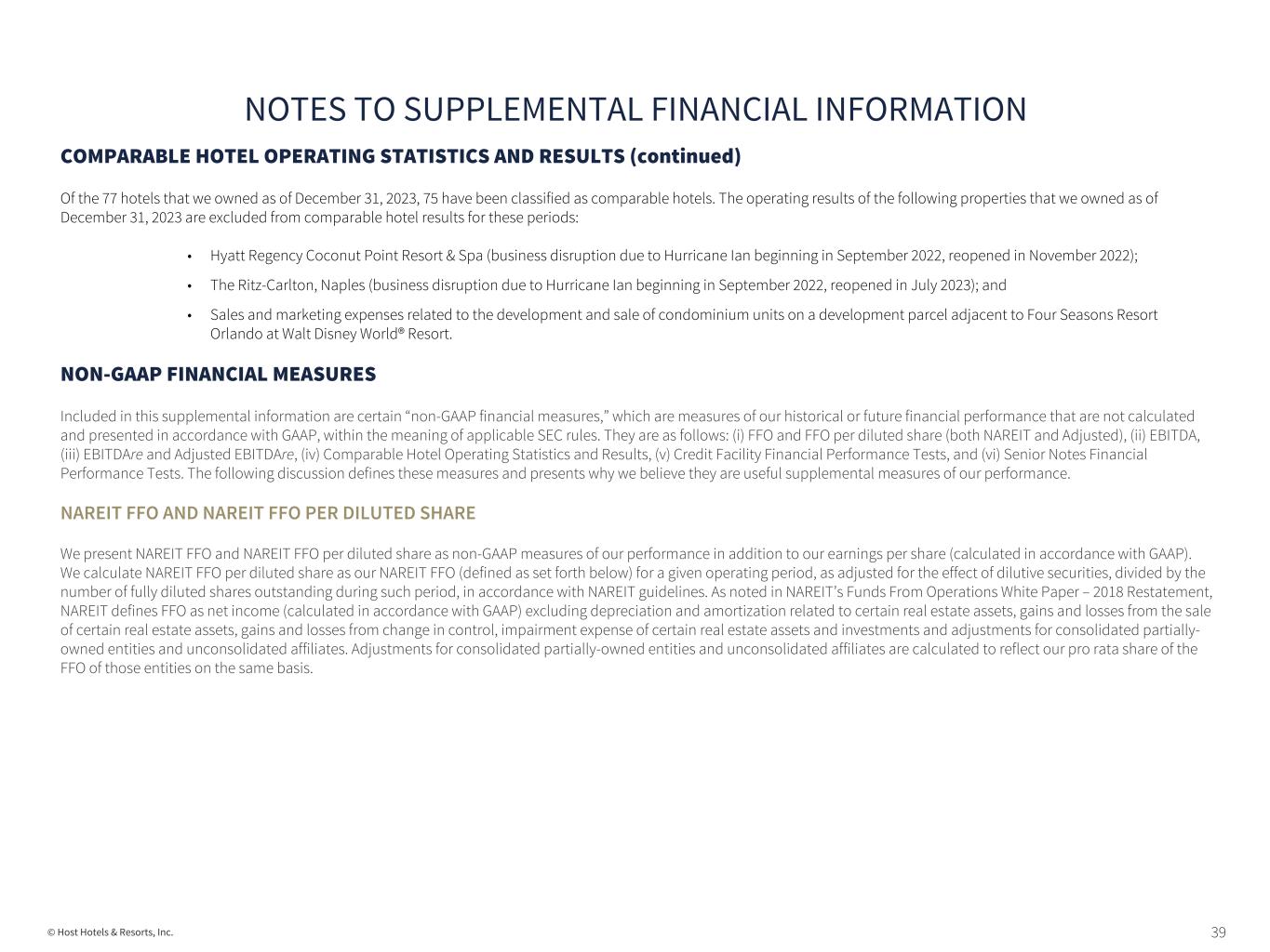 39© Host Hotels & Resorts, Inc. COMPARABLE HOTEL OPERATING STATISTICS AND RESULTS (continued) Of the 77 hotels that we owned as of December 31, 2023, 75 have been classified as comparable hotels. The operating results of the following properties that we owned as of December 31, 2023 are excluded from comparable hotel results for these periods: • Hyatt Regency Coconut Point Resort & Spa (business disruption due to Hurricane Ian beginning in September 2022, reopened in November 2022); • The Ritz-Carlton, Naples (business disruption due to Hurricane Ian beginning in September 2022, reopened in July 2023); and • Sales and marketing expenses related to the development and sale of condominium units on a development parcel adjacent to Four Seasons Resort Orlando at Walt Disney World® Resort. NON-GAAP FINANCIAL MEASURES Included in this supplemental information are certain “non-GAAP financial measures,” which are measures of our historical or future financial performance that are not calculated and presented in accordance with GAAP, within the meaning of applicable SEC rules. They are as follows: (i) FFO and FFO per diluted share (both NAREIT and Adjusted), (ii) EBITDA, (iii) EBITDAre and Adjusted EBITDAre, (iv) Comparable Hotel Operating Statistics and Results, (v) Credit Facility Financial Performance Tests, and (vi) Senior Notes Financial Performance Tests. The following discussion defines these measures and presents why we believe they are useful supplemental measures of our performance. NAREIT FFO AND NAREIT FFO PER DILUTED SHARE We present NAREIT FFO and NAREIT FFO per diluted share as non-GAAP measures of our performance in addition to our earnings per share (calculated in accordance with GAAP). We calculate NAREIT FFO per diluted share as our NAREIT FFO (defined as set forth below) for a given operating period, as adjusted for the effect of dilutive securities, divided by the number of fully diluted shares outstanding during such period, in accordance with NAREIT guidelines. As noted in NAREIT’s Funds From Operations White Paper – 2018 Restatement, NAREIT defines FFO as net income (calculated in accordance with GAAP) excluding depreciation and amortization related to certain real estate assets, gains and losses from the sale of certain real estate assets, gains and losses from change in control, impairment expense of certain real estate assets and investments and adjustments for consolidated partially- owned entities and unconsolidated affiliates. Adjustments for consolidated partially-owned entities and unconsolidated affiliates are calculated to reflect our pro rata share of the FFO of those entities on the same basis. NOTES TO SUPPLEMENTAL FINANCIAL INFORMATION