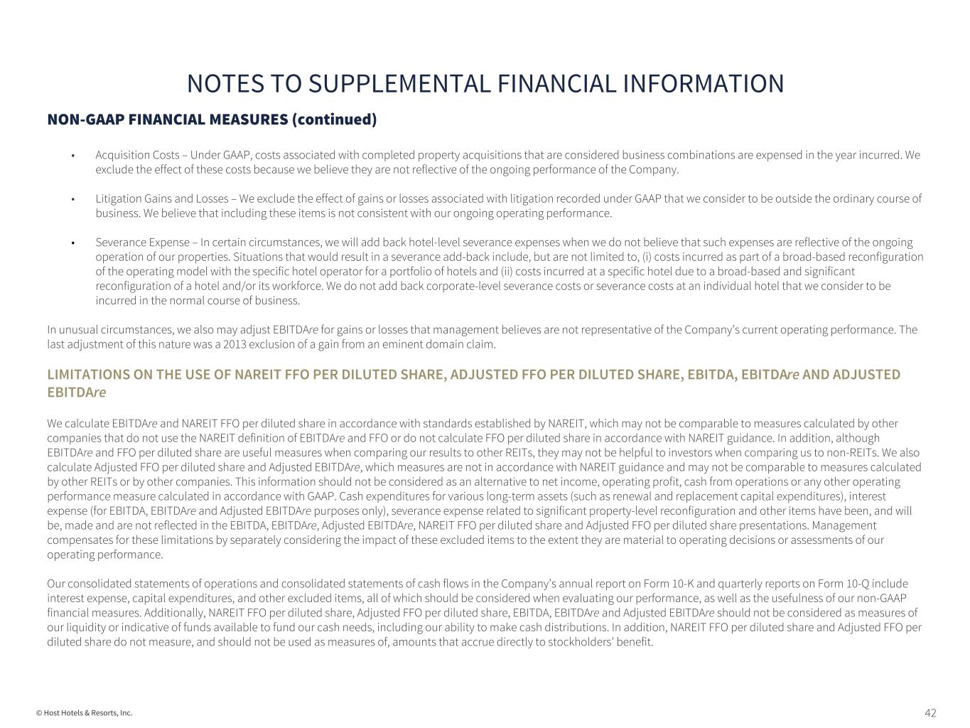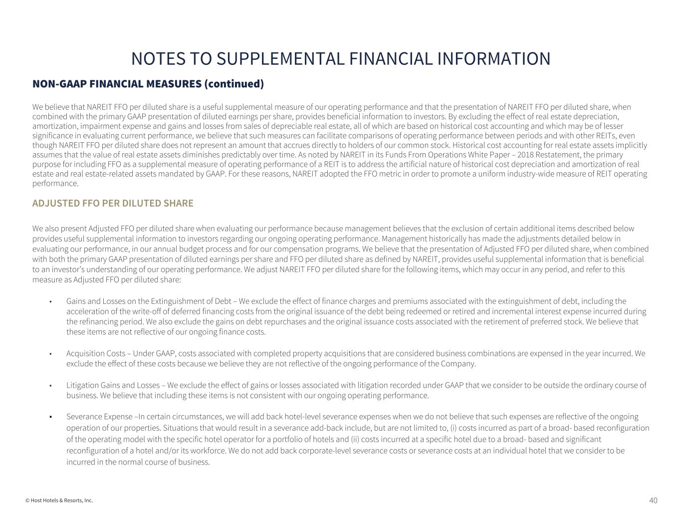40© Host Hotels & Resorts, Inc. NON-GAAP FINANCIAL MEASURES (continued) We believe that NAREIT FFO per diluted share is a useful supplemental measure of our operating performance and that the presentation of NAREIT FFO per diluted share, when combined with the primary GAAP presentation of diluted earnings per share, provides beneficial information to investors. By excluding the effect of real estate depreciation, amortization, impairment expense and gains and losses from sales of depreciable real estate, all of which are based on historical cost accounting and which may be of lesser significance in evaluating current performance, we believe that such measures can facilitate comparisons of operating performance between periods and with other REITs, even though NAREIT FFO per diluted share does not represent an amount that accrues directly to holders of our common stock. Historical cost accounting for real estate assets implicitly assumes that the value of real estate assets diminishes predictably over time. As noted by NAREIT in its Funds From Operations White Paper – 2018 Restatement, the primary purpose for including FFO as a supplemental measure of operating performance of a REIT is to address the artificial nature of historical cost depreciation and amortization of real estate and real estate-related assets mandated by GAAP. For these reasons, NAREIT adopted the FFO metric in order to promote a uniform industry-wide measure of REIT operating performance. ADJUSTED FFO PER DILUTED SHARE We also present Adjusted FFO per diluted share when evaluating our performance because management believes that the exclusion of certain additional items described below provides useful supplemental information to investors regarding our ongoing operating performance. Management historically has made the adjustments detailed below in evaluating our performance, in our annual budget process and for our compensation programs. We believe that the presentation of Adjusted FFO per diluted share, when combined with both the primary GAAP presentation of diluted earnings per share and FFO per diluted share as defined by NAREIT, provides useful supplemental information that is beneficial to an investor’s understanding of our operating performance. We adjust NAREIT FFO per diluted share for the following items, which may occur in any period, and refer to this measure as Adjusted FFO per diluted share: • Gains and Losses on the Extinguishment of Debt – We exclude the effect of finance charges and premiums associated with the extinguishment of debt, including the acceleration of the write-off of deferred financing costs from the original issuance of the debt being redeemed or retired and incremental interest expense incurred during the refinancing period. We also exclude the gains on debt repurchases and the original issuance costs associated with the retirement of preferred stock. We believe that these items are not reflective of our ongoing finance costs. • Acquisition Costs – Under GAAP, costs associated with completed property acquisitions that are considered business combinations are expensed in the year incurred. We exclude the effect of these costs because we believe they are not reflective of the ongoing performance of the Company. • Litigation Gains and Losses – We exclude the effect of gains or losses associated with litigation recorded under GAAP that we consider to be outside the ordinary course of business. We believe that including these items is not consistent with our ongoing operating performance. • Severance Expense –In certain circumstances, we will add back hotel-level severance expenses when we do not believe that such expenses are reflective of the ongoing operation of our properties. Situations that would result in a severance add-back include, but are not limited to, (i) costs incurred as part of a broad- based reconfiguration of the operating model with the specific hotel operator for a portfolio of hotels and (ii) costs incurred at a specific hotel due to a broad- based and significant reconfiguration of a hotel and/or its workforce. We do not add back corporate-level severance costs or severance costs at an individual hotel that we consider to be incurred in the normal course of business. NOTES TO SUPPLEMENTAL FINANCIAL INFORMATION