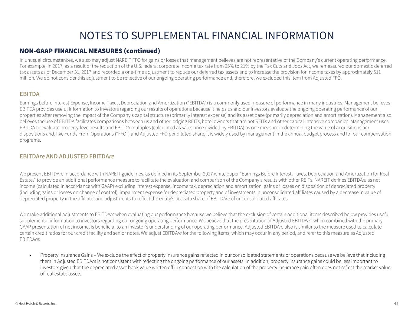 41© Host Hotels & Resorts, Inc. NON-GAAP FINANCIAL MEASURES (continued) In unusual circumstances, we also may adjust NAREIT FFO for gains or losses that management believes are not representative of the Company’s current operating performance. For example, in 2017, as a result of the reduction of the U.S. federal corporate income tax rate from 35% to 21% by the Tax Cuts and Jobs Act, we remeasured our domestic deferred tax assets as of December 31, 2017 and recorded a one-time adjustment to reduce our deferred tax assets and to increase the provision for income taxes by approximately $11 million. We do not consider this adjustment to be reflective of our ongoing operating performance and, therefore, we excluded this item from Adjusted FFO. EBITDA Earnings before Interest Expense, Income Taxes, Depreciation and Amortization (“EBITDA”) is a commonly used measure of performance in many industries. Management believes EBITDA provides useful information to investors regarding our results of operations because it helps us and our investors evaluate the ongoing operating performance of our properties after removing the impact of the Company’s capital structure (primarily interest expense) and its asset base (primarily depreciation and amortization). Management also believes the use of EBITDA facilitates comparisons between us and other lodging REITs, hotel owners that are not REITs and other capital-intensive companies. Management uses EBITDA to evaluate property-level results and EBITDA multiples (calculated as sales price divided by EBITDA) as one measure in determining the value of acquisitions and dispositions and, like Funds From Operations (“FFO”) and Adjusted FFO per diluted share, it is widely used by management in the annual budget process and for our compensation programs. EBITDAre AND ADJUSTED EBITDAre We present EBITDAre in accordance with NAREIT guidelines, as defined in its September 2017 white paper “Earnings Before Interest, Taxes, Depreciation and Amortization for Real Estate,” to provide an additional performance measure to facilitate the evaluation and comparison of the Company’s results with other REITs. NAREIT defines EBITDAre as net income (calculated in accordance with GAAP) excluding interest expense, income tax, depreciation and amortization, gains or losses on disposition of depreciated property (including gains or losses on change of control), impairment expense for depreciated property and of investments in unconsolidated affiliates caused by a decrease in value of depreciated property in the affiliate, and adjustments to reflect the entity’s pro rata share of EBITDAre of unconsolidated affiliates. We make additional adjustments to EBITDAre when evaluating our performance because we believe that the exclusion of certain additional items described below provides useful supplemental information to investors regarding our ongoing operating performance. We believe that the presentation of Adjusted EBITDAre, when combined with the primary GAAP presentation of net income, is beneficial to an investor’s understanding of our operating performance. Adjusted EBITDAre also is similar to the measure used to calculate certain credit ratios for our credit facility and senior notes. We adjust EBITDAre for the following items, which may occur in any period, and refer to this measure as Adjusted EBITDAre: • Property Insurance Gains – We exclude the effect of property insurance gains reflected in our consolidated statements of operations because we believe that including them in Adjusted EBITDAre is not consistent with reflecting the ongoing performance of our assets. In addition, property insurance gains could be less important to investors given that the depreciated asset book value written off in connection with the calculation of the property insurance gain often does not reflect the market value of real estate assets. NOTES TO SUPPLEMENTAL FINANCIAL INFORMATION