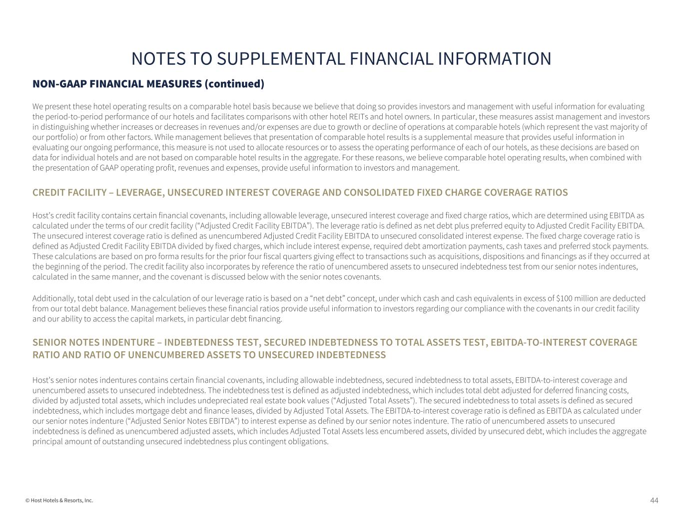 44© Host Hotels & Resorts, Inc. NON-GAAP FINANCIAL MEASURES (continued) We present these hotel operating results on a comparable hotel basis because we believe that doing so provides investors and management with useful information for evaluating the period-to-period performance of our hotels and facilitates comparisons with other hotel REITs and hotel owners. In particular, these measures assist management and investors in distinguishing whether increases or decreases in revenues and/or expenses are due to growth or decline of operations at comparable hotels (which represent the vast majority of our portfolio) or from other factors. While management believes that presentation of comparable hotel results is a supplemental measure that provides useful information in evaluating our ongoing performance, this measure is not used to allocate resources or to assess the operating performance of each of our hotels, as these decisions are based on data for individual hotels and are not based on comparable hotel results in the aggregate. For these reasons, we believe comparable hotel operating results, when combined with the presentation of GAAP operating profit, revenues and expenses, provide useful information to investors and management. CREDIT FACILITY – LEVERAGE, UNSECURED INTEREST COVERAGE AND CONSOLIDATED FIXED CHARGE COVERAGE RATIOS Host’s credit facility contains certain financial covenants, including allowable leverage, unsecured interest coverage and fixed charge ratios, which are determined using EBITDA as calculated under the terms of our credit facility (“Adjusted Credit Facility EBITDA”). The leverage ratio is defined as net debt plus preferred equity to Adjusted Credit Facility EBITDA. The unsecured interest coverage ratio is defined as unencumbered Adjusted Credit Facility EBITDA to unsecured consolidated interest expense. The fixed charge coverage ratio is defined as Adjusted Credit Facility EBITDA divided by fixed charges, which include interest expense, required debt amortization payments, cash taxes and preferred stock payments. These calculations are based on pro forma results for the prior four fiscal quarters giving effect to transactions such as acquisitions, dispositions and financings as if they occurred at the beginning of the period. The credit facility also incorporates by reference the ratio of unencumbered assets to unsecured indebtedness test from our senior notes indentures, calculated in the same manner, and the covenant is discussed below with the senior notes covenants. Additionally, total debt used in the calculation of our leverage ratio is based on a “net debt” concept, under which cash and cash equivalents in excess of $100 million are deducted from our total debt balance. Management believes these financial ratios provide useful information to investors regarding our compliance with the covenants in our credit facility and our ability to access the capital markets, in particular debt financing. SENIOR NOTES INDENTURE – INDEBTEDNESS TEST, SECURED INDEBTEDNESS TO TOTAL ASSETS TEST, EBITDA-TO-INTEREST COVERAGE RATIO AND RATIO OF UNENCUMBERED ASSETS TO UNSECURED INDEBTEDNESS Host’s senior notes indentures contains certain financial covenants, including allowable indebtedness, secured indebtedness to total assets, EBITDA-to-interest coverage and unencumbered assets to unsecured indebtedness. The indebtedness test is defined as adjusted indebtedness, which includes total debt adjusted for deferred financing costs, divided by adjusted total assets, which includes undepreciated real estate book values (“Adjusted Total Assets”). The secured indebtedness to total assets is defined as secured indebtedness, which includes mortgage debt and finance leases, divided by Adjusted Total Assets. The EBITDA-to-interest coverage ratio is defined as EBITDA as calculated under our senior notes indenture (“Adjusted Senior Notes EBITDA”) to interest expense as defined by our senior notes indenture. The ratio of unencumbered assets to unsecured indebtedness is defined as unencumbered adjusted assets, which includes Adjusted Total Assets less encumbered assets, divided by unsecured debt, which includes the aggregate principal amount of outstanding unsecured indebtedness plus contingent obligations. NOTES TO SUPPLEMENTAL FINANCIAL INFORMATION