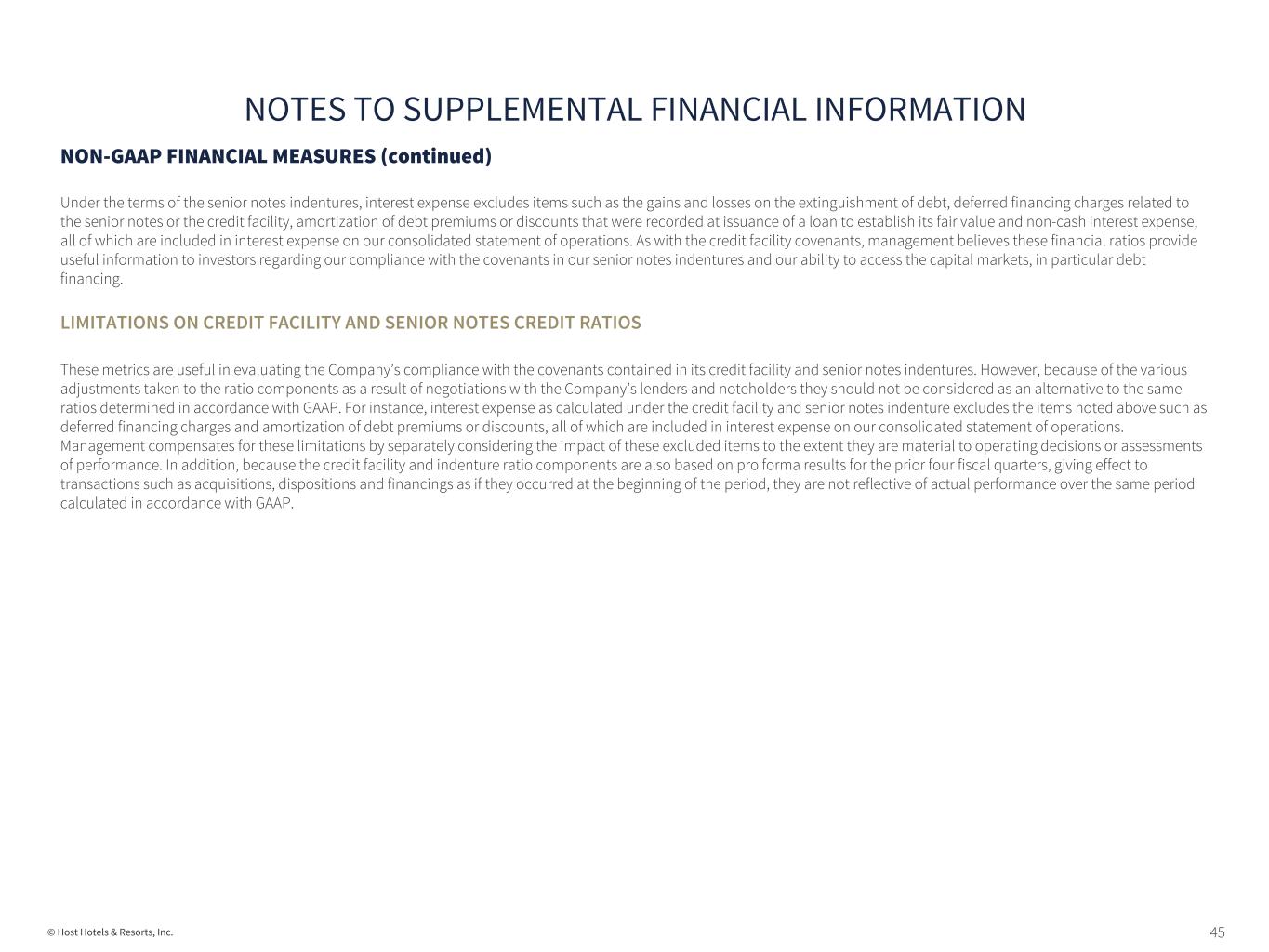 45© Host Hotels & Resorts, Inc. NON-GAAP FINANCIAL MEASURES (continued) Under the terms of the senior notes indentures, interest expense excludes items such as the gains and losses on the extinguishment of debt, deferred financing charges related to the senior notes or the credit facility, amortization of debt premiums or discounts that were recorded at issuance of a loan to establish its fair value and non-cash interest expense, all of which are included in interest expense on our consolidated statement of operations. As with the credit facility covenants, management believes these financial ratios provide useful information to investors regarding our compliance with the covenants in our senior notes indentures and our ability to access the capital markets, in particular debt financing. LIMITATIONS ON CREDIT FACILITY AND SENIOR NOTES CREDIT RATIOS These metrics are useful in evaluating the Company’s compliance with the covenants contained in its credit facility and senior notes indentures. However, because of the various adjustments taken to the ratio components as a result of negotiations with the Company’s lenders and noteholders they should not be considered as an alternative to the same ratios determined in accordance with GAAP. For instance, interest expense as calculated under the credit facility and senior notes indenture excludes the items noted above such as deferred financing charges and amortization of debt premiums or discounts, all of which are included in interest expense on our consolidated statement of operations. Management compensates for these limitations by separately considering the impact of these excluded items to the extent they are material to operating decisions or assessments of performance. In addition, because the credit facility and indenture ratio components are also based on pro forma results for the prior four fiscal quarters, giving effect to transactions such as acquisitions, dispositions and financings as if they occurred at the beginning of the period, they are not reflective of actual performance over the same period calculated in accordance with GAAP. NOTES TO SUPPLEMENTAL FINANCIAL INFORMATION