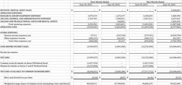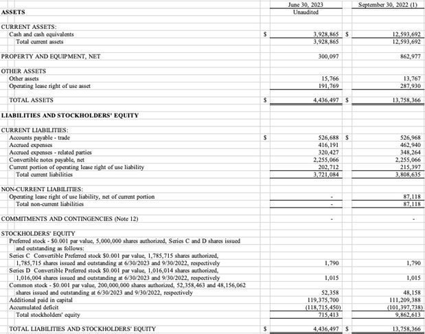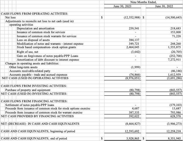 As of June 30, 2023, we had cash and cash equivalents of $3.93 million dollars, as compared to $12.59 million at the end of September 30, 2022. Net cash used in operations for the nine-month period ending June 30, 2023 was $8.97 million dollars compared with $3.69 million in the prior year.