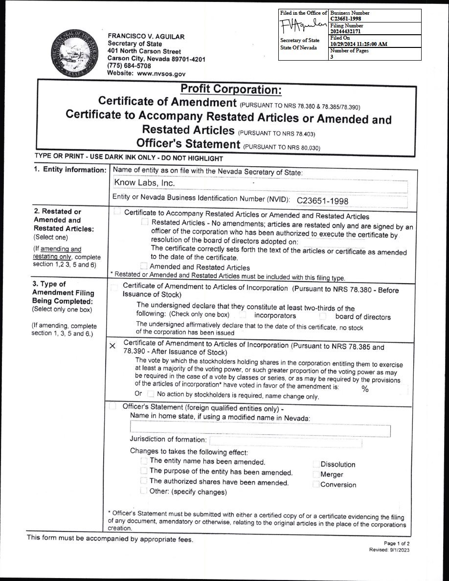 EX-3.1 2 knwn_ex31.htm CERTIFICATE OF AMENDMENT knwn_ex31.htm