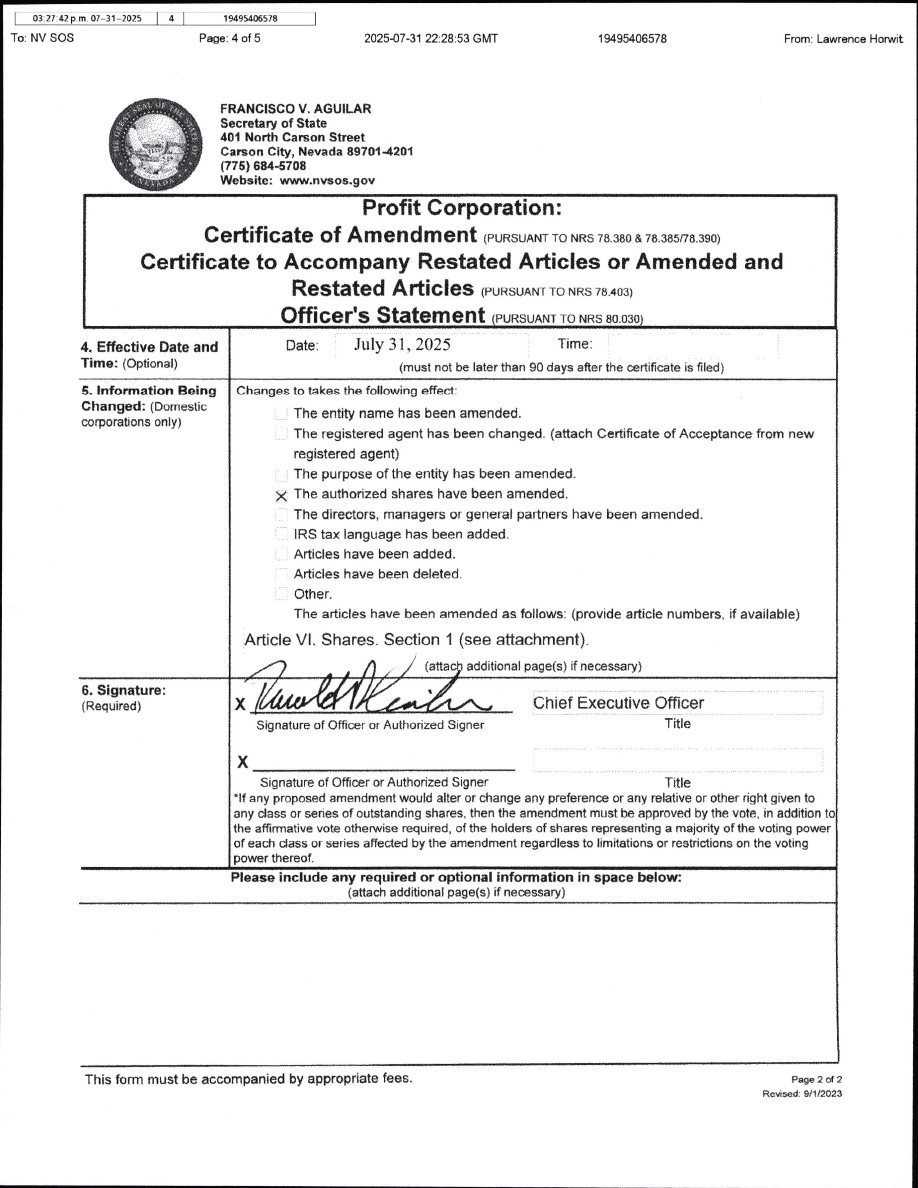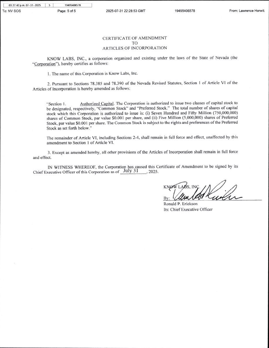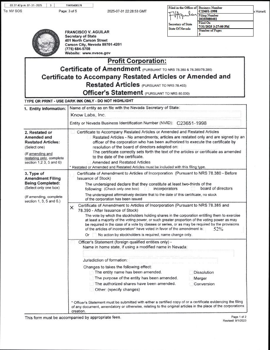 EX-3.1 2 knwn_ex31.htm AMENDED AND RESTATED ARTICLES knwn_ex31.htm