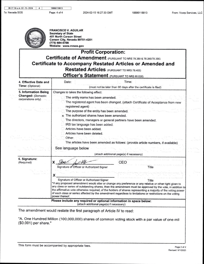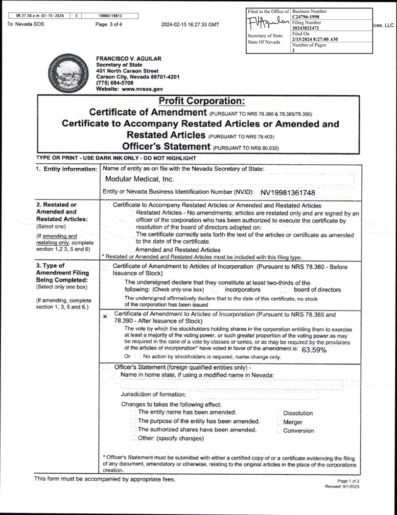 EX-3.1 2 ea193897ex3-1_modular.htm CERTIFICATE OF AMENDMENT TO AMENDED AND RESTATED ARTICLES OF INCORPORATION OF MODULAR MEDICAL, INC., FILED WITH THE SECRETARY OF STATE OF THE STATE OF NEVADA ON FEBRUARY 15, 2024