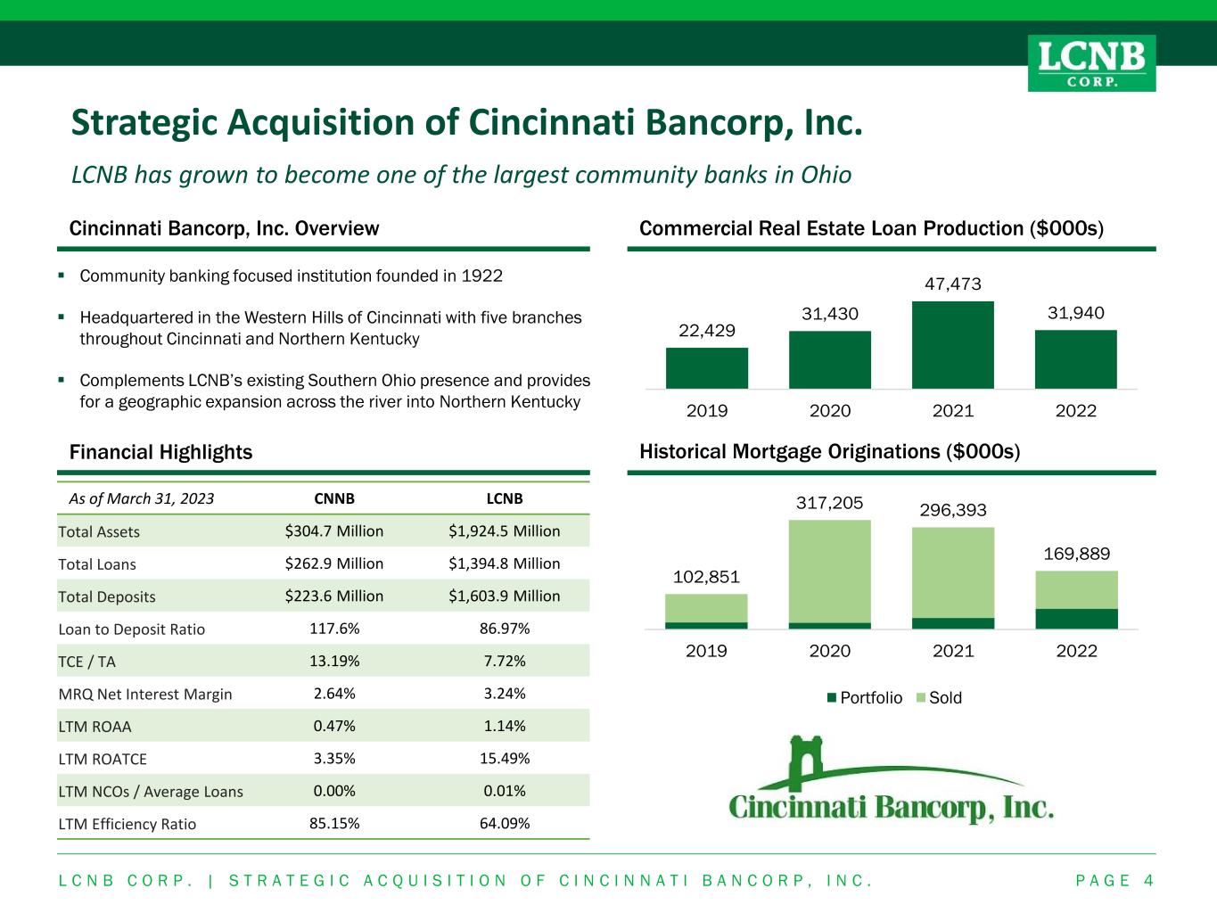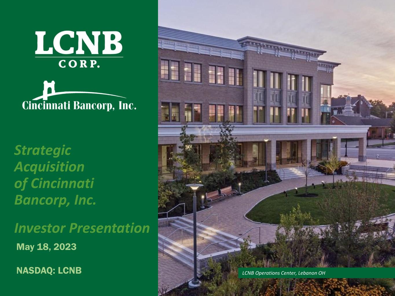 LCNB Operations Center, Lebanon OH Investor Presentation May 18, 2023 NASDAQ: LCNB Strategic Acquisition of Cincinnati Bancorp, Inc.