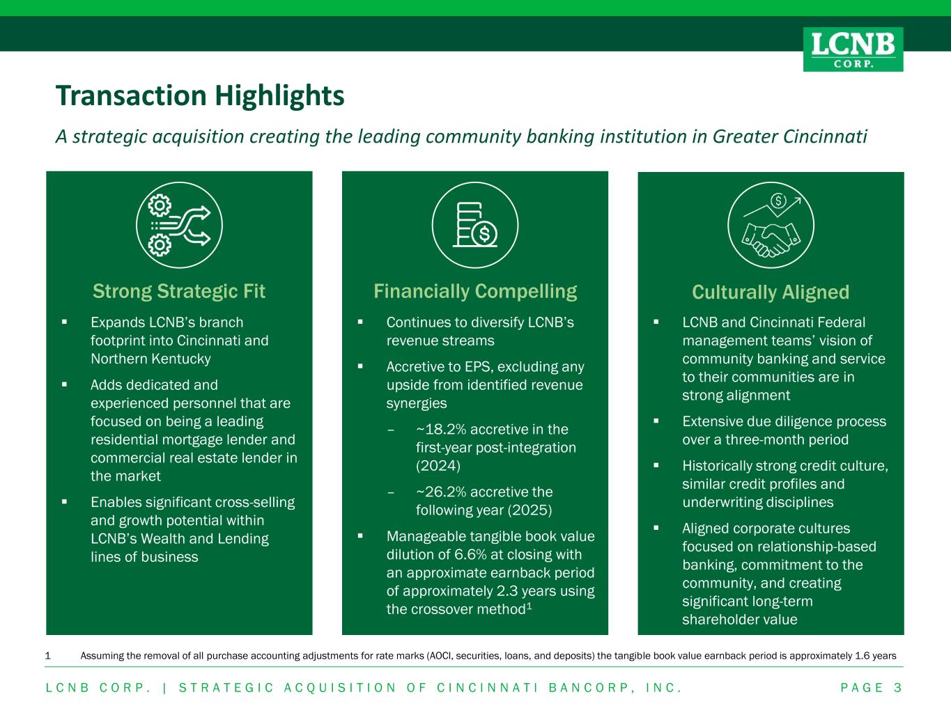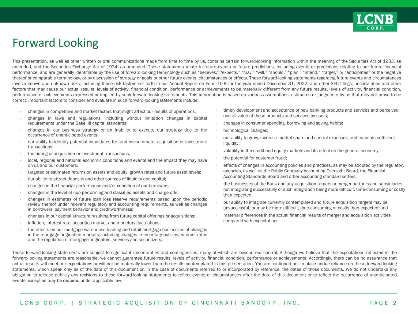 Forward Looking This presentation, as well as other written or oral communications made from time to time by us, contains certain forward-looking information within the meaning of the Securities Act of 1933, as amended, and the Securities Exchange Act of 1934, as amended. These statements relate to future events or future predictions, including events or predictions relating to our future financial performance, and are generally identifiable by the use of forward-looking terminology such as “believes,” “expects,” “may,” “will,” “should,” “plan,” “intend,” “target,” or “anticipates” or the negative thereof or comparable terminology, or by discussion of strategy or goals or other future events, circumstances or effects. These forward-looking statements regarding future events and circumstances involve known and unknown risks, including those risk factors set forth in our Annual Report on Form 10-K for the year ended December 31, 2022, and other SEC filings, uncertainties and other factors that may cause our actual results, levels of activity, financial condition, performance or achievements to be materially different from any future results, levels of activity, financial condition, performance or achievements expressed or implied by such forward-looking statements. This information is based on various assumptions, estimates or judgments by us that may not prove to be correct. Important factors to consider and evaluate in such forward-looking statements include: • changes in competitive and market factors that might affect our results of operations; • changes in laws and regulations, including without limitation changes in capital requirements under the Basel III capital standards; • changes in our business strategy or an inability to execute our strategy due to the occurrence of unanticipated events; • our ability to identify potential candidates for, and consummate, acquisition or investment transactions; • the timing of acquisition or investment transactions; • local, regional and national economic conditions and events and the impact they may have on us and our customers; • targeted or estimated returns on assets and equity, growth rates and future asset levels; • our ability to attract deposits and other sources of liquidity and capital; • changes in the financial performance and/or condition of our borrowers; • changes in the level of non-performing and classified assets and charge-offs; • changes in estimates of future loan loss reserve requirements based upon the periodic review thereof under relevant regulatory and accounting requirements, as well as changes in borrowers’ payment behavior and creditworthiness; • changes in our capital structure resulting from future capital offerings or acquisitions; • inflation, interest rate, securities market and monetary fluctuations; • the effects on our mortgage warehouse lending and retail mortgage businesses of changes in the mortgage origination markets, including changes in monetary policies, interest rates and the regulation of mortgage originators, services and securitizers; These forward-looking statements are subject to significant uncertainties and contingencies, many of which are beyond our control. Although we believe that the expectations reflected in the forward-looking statements are reasonable, we cannot guarantee future results, levels of activity, financial condition, performance or achievements. Accordingly, there can be no assurance that actual results will meet our expectations or will not be materially lower than the results contemplated in this presentation. You are cautioned not to place undue reliance on these forward-looking statements, which speak only as of the date of this document or, in the case of documents referred to or incorporated by reference, the dates of those documents. We do not undertake any obligation to release publicly any revisions to these forward-looking statements to reflect events or circumstances after the date of this document or to reflect the occurrence of unanticipated events, except as may be required under applicable law. • timely development and acceptance of new banking products and services and perceived overall value of these products and services by users; • changes in consumer spending, borrowing and saving habits; • technological changes; • our ability to grow, increase market share and control expenses, and maintain sufficient liquidity; • volatility in the credit and equity markets and its effect on the general economy; • the potential for customer fraud; • effects of changes in accounting policies and practices, as may be adopted by the regulatory agencies, as well as the Public Company Accounting Oversight Board, the Financial Accounting Standards Board and other accounting standard setters; • the businesses of the Bank and any acquisition targets or merger partners and subsidiaries not integrating successfully or such integration being more difficult, time-consuming or costly than expected; • our ability to integrate currently contemplated and future acquisition targets may be unsuccessful, or may be more difficult, time-consuming or costly than expected; and • material differences in the actual financial results of merger and acquisition activities compared with expectations. L C N B C O R P . | S T R A T E G I C A C Q U I S I T I O N O F C I N C I N N A T I B A N C O R P , I N C . P A G E 2 Forward Looking
