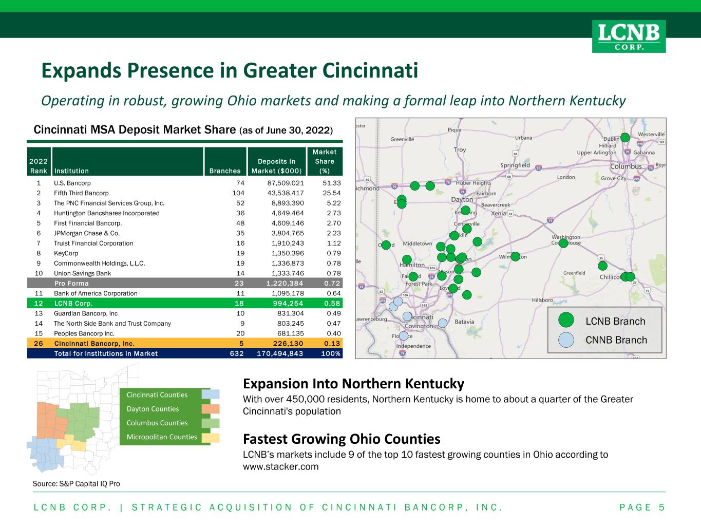 102,851 317,205 296,393 169,889 2019 2020 2021 2022 Portfolio Sold 22,429 31,430 47,473 31,940 2019 2020 2021 2022 Strategic Acquisition of Cincinnati Bancorp, Inc. LCNB has grown to become one of the largest community banks in Ohio L C N B C O R P . | S T R A T E G I C A C Q U I S I T I O N O F C I N C I N N A T I B A N C O R P , I N C . P A G E 4 Cincinnati Bancorp, Inc. Overview Commercial Real Estate Loan Production ($000s) Historical Mortgage Originations ($000s)Financial Highlights ▪ Community banking focused institution founded in 1922 ▪ Headquartered in the Western Hills of Cincinnati with five branches throughout Cincinnati and Northern Kentucky ▪ Complements LCNB’s existing Southern Ohio presence and provides for a geographic expansion across the river into Northern Kentucky As of March 31, 2023 CNNB LCNB Total Assets $304.7 Million $1,924.5 Million Total Loans $262.9 Million $1,394.8 Million Total Deposits $223.6 Million $1,603.9 Million Loan to Deposit Ratio 117.6% 86.97% TCE / TA 13.19% 7.72% MRQ Net Interest Margin 2.64% 3.24% LTM ROAA 0.47% 1.14% LTM ROATCE 3.35% 15.49% LTM NCOs / Average Loans 0.00% 0.01% LTM Efficiency Ratio 85.15% 64.09%