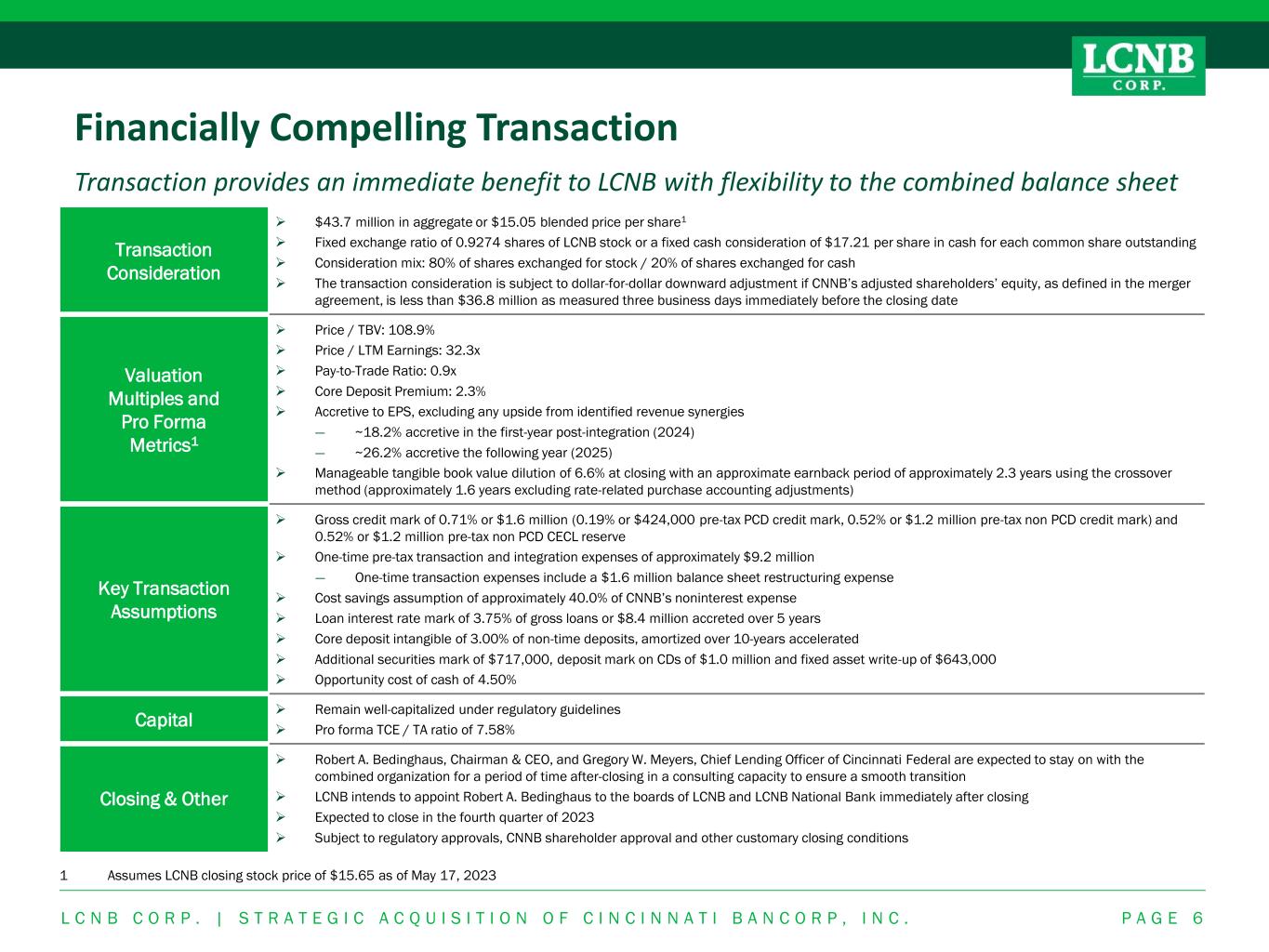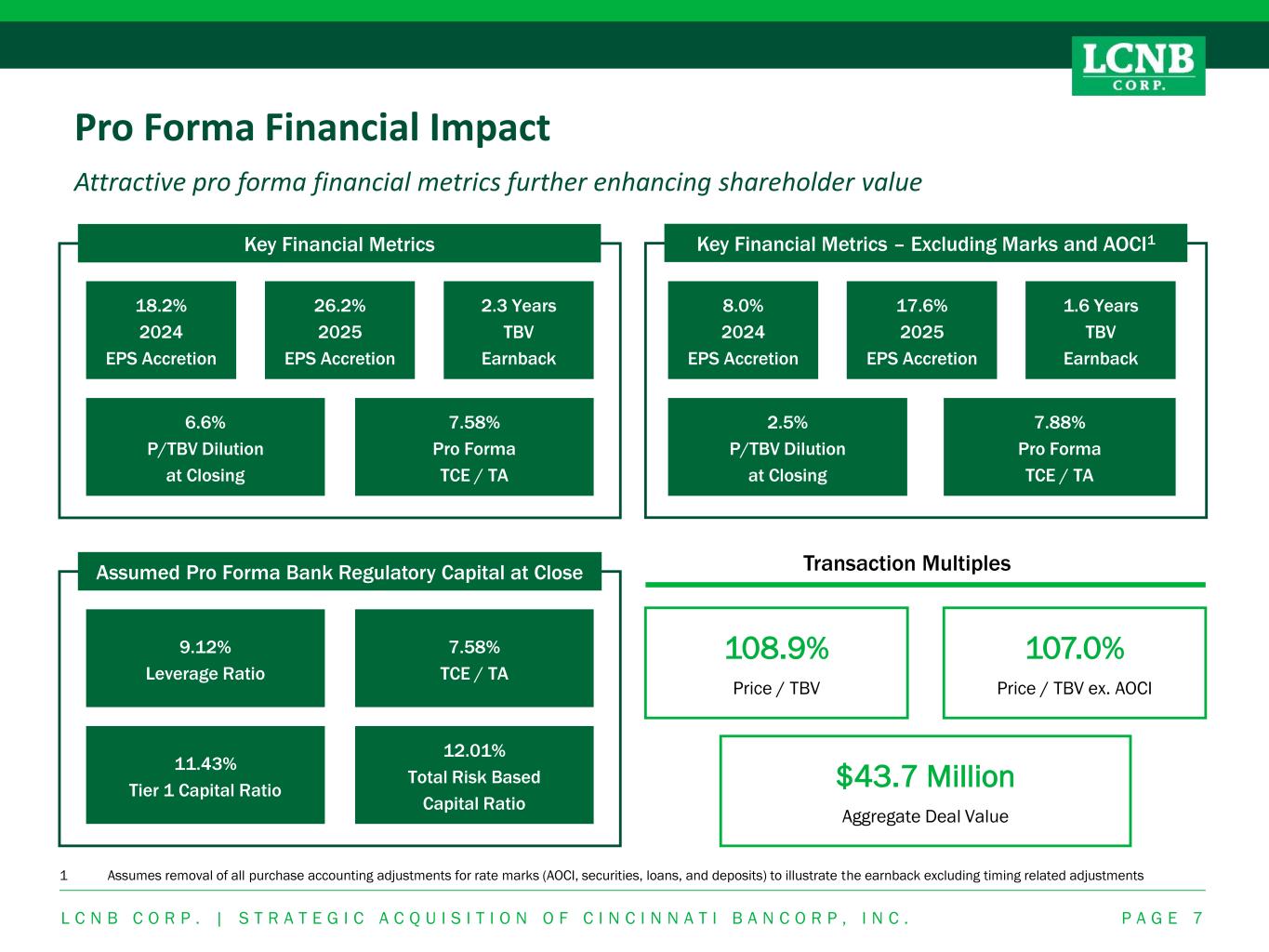 Financially Compelling Transaction Transaction provides an immediate benefit to LCNB with flexibility to the combined balance sheet L C N B C O R P . | S T R A T E G I C A C Q U I S I T I O N O F C I N C I N N A T I B A N C O R P , I N C . P A G E 6 Transaction Consideration ➢ $43.7 million in aggregate or $15.05 blended price per share1 ➢ Fixed exchange ratio of 0.9274 shares of LCNB stock or a fixed cash consideration of $17.21 per share in cash for each common share outstanding ➢ Consideration mix: 80% of shares exchanged for stock / 20% of shares exchanged for cash ➢ The transaction consideration is subject to dollar-for-dollar downward adjustment if CNNB’s adjusted shareholders’ equity, as defined in the merger agreement, is less than $36.8 million as measured three business days immediately before the closing date Valuation Multiples and Pro Forma Metrics1 ➢ Price / TBV: 108.9% ➢ Price / LTM Earnings: 32.3x ➢ Pay-to-Trade Ratio: 0.9x ➢ Core Deposit Premium: 2.3% ➢ Accretive to EPS, excluding any upside from identified revenue synergies — ~18.2% accretive in the first-year post-integration (2024) — ~26.2% accretive the following year (2025) ➢ Manageable tangible book value dilution of 6.6% at closing with an approximate earnback period of approximately 2.3 years using the crossover method (approximately 1.6 years excluding rate-related purchase accounting adjustments) Key Transaction Assumptions ➢ Gross credit mark of 0.71% or $1.6 million (0.19% or $424,000 pre-tax PCD credit mark, 0.52% or $1.2 million pre-tax non PCD credit mark) and 0.52% or $1.2 million pre-tax non PCD CECL reserve ➢ One-time pre-tax transaction and integration expenses of approximately $9.2 million — One-time transaction expenses include a $1.6 million balance sheet restructuring expense ➢ Cost savings assumption of approximately 40.0% of CNNB’s noninterest expense ➢ Loan interest rate mark of 3.75% of gross loans or $8.4 million accreted over 5 years ➢ Core deposit intangible of 3.00% of non-time deposits, amortized over 10-years accelerated ➢ Additional securities mark of $717,000, deposit mark on CDs of $1.0 million and fixed asset write-up of $643,000 ➢ Opportunity cost of cash of 4.50% Capital ➢ Remain well-capitalized under regulatory guidelines ➢ Pro forma TCE / TA ratio of 7.58% Closing & Other ➢ Robert A. Bedinghaus, Chairman & CEO, and Gregory W. Meyers, Chief Lending Officer of Cincinnati Federal are expected to stay on with the combined organization for a period of time after-closing in a consulting capacity to ensure a smooth transition ➢ LCNB intends to appoint Robert A. Bedinghaus to the boards of LCNB and LCNB National Bank immediately after closing ➢ Expected to close in the fourth quarter of 2023 ➢ Subject to regulatory approvals, CNNB shareholder approval and other customary closing conditions 1 Assumes LCNB closing stock price of $15.65 as of May 17, 2023