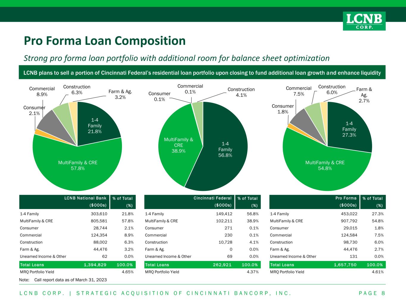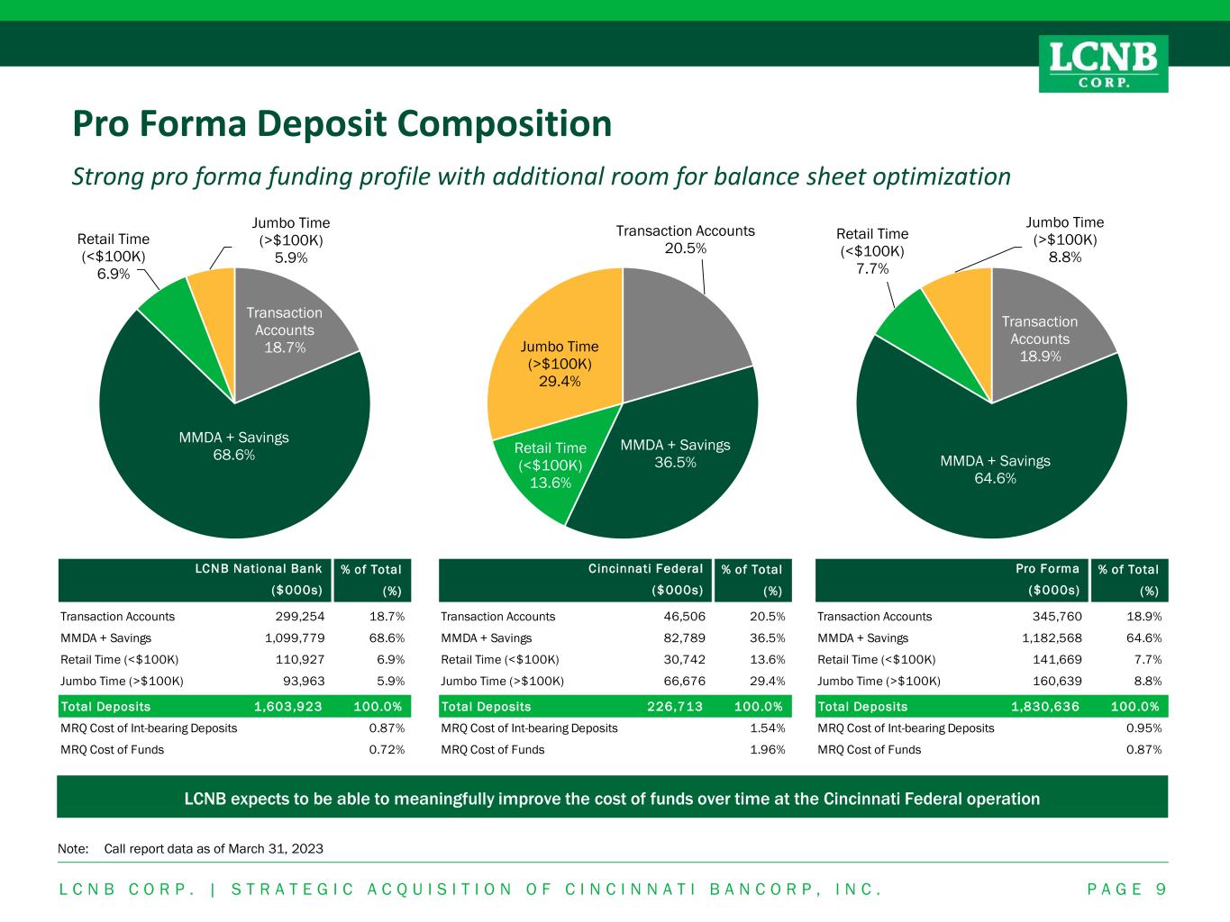 % of Total (%) 1-4 Family 453,022 27.3% MultiFamily & CRE 907,792 54.8% Consumer 29,015 1.8% Commercial 124,584 7.5% Construction 98,730 6.0% Farm & Ag. 44,476 2.7% Unearned Income & Other 131 0.0% Total Loans 1,657,750 100.0% MRQ Portfolio Yield 4.61% ($000s) Pro Forma% of Total (%) 1-4 Family 149,412 56.8% MultiFamily & CRE 102,211 38.9% Consumer 271 0.1% Commercial 230 0.1% Construction 10,728 4.1% Farm & Ag. 0 0.0% Unearned Income & Other 69 0.0% Total Loans 262,921 100.0% MRQ Portfolio Yield 4.37% ($000s) C incinnati Federal% of Total (%) 1-4 Family 303,610 21.8% MultiFamily & CRE 805,581 57.8% Consumer 28,744 2.1% Commercial 124,354 8.9% Construction 88,002 6.3% Farm & Ag. 44,476 3.2% Unearned Income & Other 62 0.0% Total Loans 1,394,829 100.0% MRQ Portfolio Yield 4.65% ($000s) LCNB National Bank 1-4 Family 27.3% MultiFamily & CRE 54.8% Consumer 1.8% Commercial 7.5% Construction 6.0% Farm & Ag. 2.7% L C N B C O R P . | S T R A T E G I C A C Q U I S I T I O N O F C I N C I N N A T I B A N C O R P , I N C . P A G E 8 Pro Forma Loan Composition Strong pro forma loan portfolio with additional room for balance sheet optimization Note: Call report data as of March 31, 2023 1-4 Family 56.8% MultiFamily & CRE 38.9% Consumer 0.1% Commercial 0.1% Construction 4.1% 1-4 Family 21.8% MultiFamily & CRE 57.8% Consumer 2.1% Commercial 8.9% Construction 6.3% Farm & Ag. 3.2% LCNB plans to sell a portion of Cincinnati Federal’s residential loan portfolio upon closing to fund additional loan growth and enhance liquidity