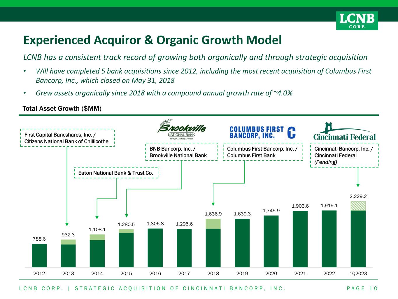 % of Total (%) Transaction Accounts 345,760 18.9% MMDA + Savings 1,182,568 64.6% Retail Time (<$100K) 141,669 7.7% Jumbo Time (>$100K) 160,639 8.8% Total Deposits 1,830,636 100.0% MRQ Cost of Int-bearing Deposits 0.95% MRQ Cost of Funds 0.87% ($000s) Pro Forma% of Total (%) Transaction Accounts 46,506 20.5% MMDA + Savings 82,789 36.5% Retail Time (<$100K) 30,742 13.6% Jumbo Time (>$100K) 66,676 29.4% Total Deposits 226,713 100.0% MRQ Cost of Int-bearing Deposits 1.54% MRQ Cost of Funds 1.96% ($000s) C incinnati Federal% of Total (%) Transaction Accounts 299,254 18.7% MMDA + Savings 1,099,779 68.6% Retail Time (<$100K) 110,927 6.9% Jumbo Time (>$100K) 93,963 5.9% Total Deposits 1,603,923 100.0% MRQ Cost of Int-bearing Deposits 0.87% MRQ Cost of Funds 0.72% ($000s) LCNB National Bank Pro Forma Deposit Composition Strong pro forma funding profile with additional room for balance sheet optimization L C N B C O R P . | S T R A T E G I C A C Q U I S I T I O N O F C I N C I N N A T I B A N C O R P , I N C . P A G E 9 Transaction Accounts 18.9% MMDA + Savings 64.6% Retail Time (<$100K) 7.7% Jumbo Time (>$100K) 8.8% Transaction Accounts 20.5% MMDA + Savings 36.5% Retail Time (<$100K) 13.6% Jumbo Time (>$100K) 29.4% Transaction Accounts 18.7% MMDA + Savings 68.6% Retail Time (<$100K) 6.9% Jumbo Time (>$100K) 5.9% LCNB expects to be able to meaningfully improve the cost of funds over time at the Cincinnati Federal operation Note: Call report data as of March 31, 2023