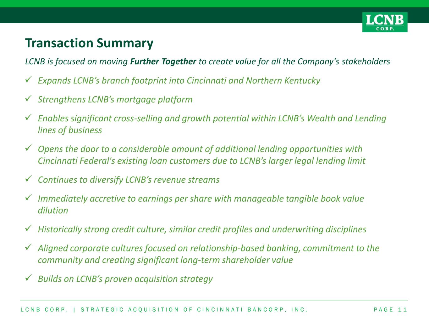L C N B C O R P . | S T R A T E G I C A C Q U I S I T I O N O F C I N C I N N A T I B A N C O R P , I N C . P A G E 1 0 Experienced Acquiror & Organic Growth Model LCNB has a consistent track record of growing both organically and through strategic acquisition • Will have completed 5 bank acquisitions since 2012, including the most recent acquisition of Columbus First Bancorp, Inc., which closed on May 31, 2018 • Grew assets organically since 2018 with a compound annual growth rate of ~4.0% First Capital Bancshares, Inc. / Citizens National Bank of Chillicothe Eaton National Bank & Trust Co. BNB Bancorp, Inc. / Brookville National Bank Columbus First Bancorp, Inc. / Columbus First Bank Total Asset Growth ($MM) 788.6 932.3 1,108.1 1,280.5 1,306.8 1,295.6 1,636.9 1,639.3 1,745.9 1,903.6 1,919.1 2,229.2 2012 2013 2014 2015 2016 2017 2018 2019 2020 2021 2022 1Q2023 Cincinnati Bancorp, Inc. / Cincinnati Federal (Pending)