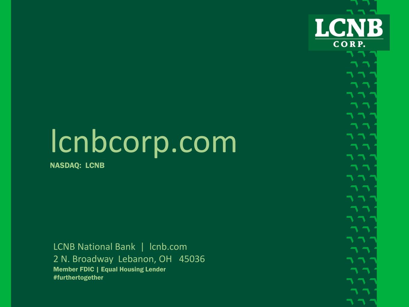 12 lcnbcorp.com NASDAQ: LCNB LCNB National Bank | lcnb.com 2 N. Broadway Lebanon, OH 45036 Member FDIC | Equal Housing Lender #furthertogether