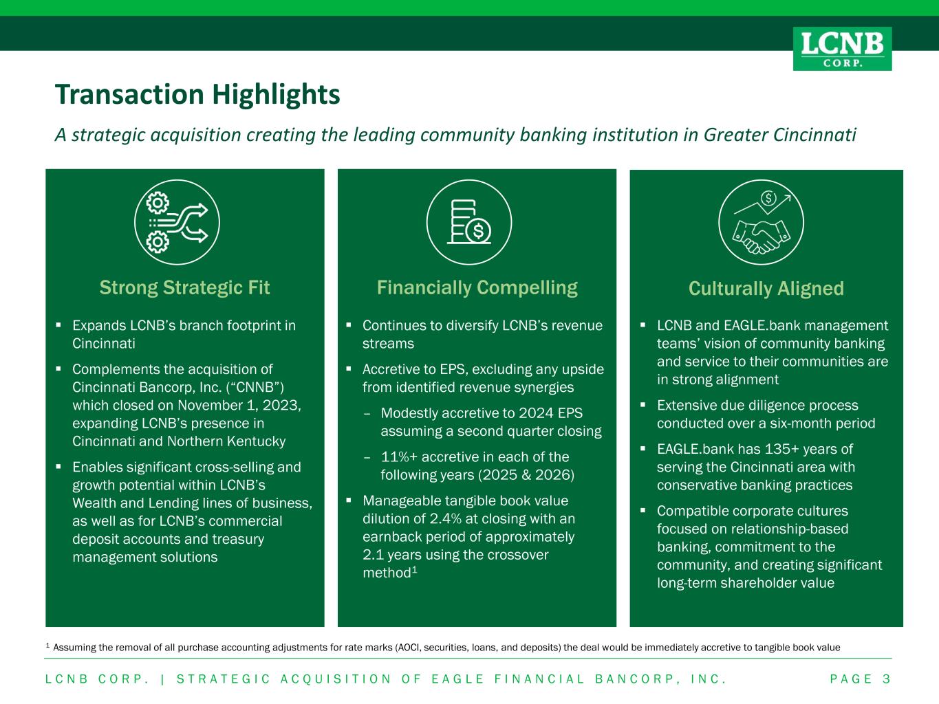 Forward Looking This presentation, as well as other written or oral communications made from time to time by us, contains certain forward-looking information within the meaning of the Securities Act of 1933, as amended, and the Securities Exchange Act of 1934, as amended. These statements relate to future events or future predictions, including events or predictions relating to our future financial performance, and are generally identifiable by the use of forward-looking terminology such as “believes,” “expects,” “may,” “will,” “should,” “plan,” “intend,” “target,” or “anticipates” or the negative thereof or comparable terminology, or by discussion of strategy or goals or other future events, circumstances or effects. These forward-looking statements regarding future events and circumstances involve known and unknown risks, including those risk factors set forth in our Annual Report on Form 10-K for the year ended December 31, 2022, and other SEC filings, uncertainties and other factors that may cause our actual results, levels of activity, financial condition, performance or achievements to be materially different from any future results, levels of activity, financial condition, performance or achievements expressed or implied by such forward-looking statements. This information is based on various assumptions, estimates or judgments by us that may not prove to be correct. Important factors to consider and evaluate in such forward-looking statements include: • changes in competitive and market factors that might affect our results of operations; • changes in laws and regulations, including without limitation changes in capital requirements under the Basel III capital standards; • changes in our business strategy or an inability to execute our strategy due to the occurrence of unanticipated events; • our ability to identify potential candidates for, and consummate, acquisition or investment transactions; • the timing of acquisition or investment transactions; • local, regional and national economic conditions and events and the impact they may have on us and our customers; • targeted or estimated returns on assets and equity, growth rates and future asset levels; • our ability to attract deposits and other sources of liquidity and capital; • changes in the financial performance and/or condition of our borrowers; • changes in the level of non-performing and classified assets and charge-offs; • changes in estimates of future loan loss reserve requirements based upon the periodic review thereof under relevant regulatory and accounting requirements, as well as changes in borrowers’ payment behavior and creditworthiness; • changes in our capital structure resulting from future capital offerings or acquisitions; • inflation, interest rate, securities market and monetary fluctuations; • the effects on our mortgage warehouse lending and retail mortgage businesses of changes in the mortgage origination markets, including changes in monetary policies, interest rates and the regulation of mortgage originators, services and securitizers; These forward-looking statements are subject to significant uncertainties and contingencies, many of which are beyond our control. Although we believe that the expectations reflected in the forward-looking statements are reasonable, we cannot guarantee future results, levels of activity, financial condition, performance or achievements. Accordingly, there can be no assurance that actual results will meet our expectations or will not be materially lower than the results contemplated in this presentation. You are cautioned not to place undue reliance on these forward-looking statements, which speak only as of the date of this document or, in the case of documents referred to or incorporated by reference, the dates of those documents. We do not undertake any obligation to release publicly any revisions to these forward-looking statements to reflect events or circumstances after the date of this document or to reflect the occurrence of unanticipated events, except as may be required under applicable law. • timely development and acceptance of new banking products and services and perceived overall value of these products and services by users; • changes in consumer spending, borrowing and saving habits; • technological changes; • our ability to grow, increase market share and control expenses, and maintain sufficient liquidity; • volatility in the credit and equity markets and its effect on the general economy; • the potential for customer fraud; • effects of changes in accounting policies and practices, as may be adopted by the regulatory agencies, as well as the Public Company Accounting Oversight Board, the Financial Accounting Standards Board and other accounting standard setters; • the businesses of the Bank and any acquisition targets or merger partners and subsidiaries not integrating successfully or such integration being more difficult, time-consuming or costly than expected; • our ability to integrate currently contemplated and future acquisition targets may be unsuccessful, or may be more difficult, time-consuming or costly than expected; and • material differences in the actual financial results of merger and acquisition activities compared with expectations. L C N B C O R P . | S T R A T E G I C A C Q U I S I T I O N O F E A G L E F I N A N C I A L B A N C O R P , I N C . P A G E 2 Forward Looking