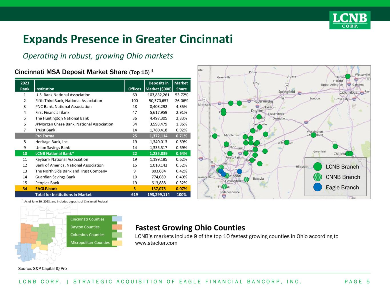 Strategic Acquisition of Eagle Financial Bancorp, Inc. LCNB has grown to become one of the largest community banks in Ohio P A G E 4 Eagle Financial Bancorp, Inc. Overview Total Assets ($000s) Total Deposits ($000s)Financial Highlights ▪ Community banking focused institution founded in 1882 ▪ Headquartered in Cincinnati, Ohio with a main office and two branch offices located in Hamilton County, Ohio ▪ Complements LCNB’s existing Southern Ohio presence ▪ Dedicated to mortgages and helping home buyers As of Sept. 30, 2023 ($mils) EFBI CNNB LCNB Total Assets $175.8 $311.1 $1,981.7 Total Loans (Excl. HFS) $140.8 $267.5 $1,458.4 Total Deposits $135.0 $214.4 $1,616.9 Loan to Deposit Ratio 104.3% 124.8% 90.2% TCE / TA 14.95% 12.27% 7.36% MRQ Net Interest Margin 2.69% 2.18% 3.04% YTD ROAA 0.07% 0.11% 0.92% YTD ROATCE 0.45% 0.88% 12.50% YTD NCOs / Average Loans 0.00% 0.00% 0.01% YTD Efficiency Ratio 97.3% 95.5% 68.7% L C N B C O R P . | S T R A T E G I C A C Q U I S I T I O N O F E A G L E F I N A N C I A L B A N C O R P , I N C . $142,788 $160,445 $174,849 $173,723 $175,765 2019 2020 2021 2022 YTD 9/23 $111,991 $128,440 $141,527 $132,825 $134,974 2019 2020 2021 2022 YTD 9/23 Note: YTD ROAA and ROATCE based on core performance, if available, and excludes reported securities gains (losses), nonrecurring items and intangible amortization expense. Source: S&P Capital IQ Pro