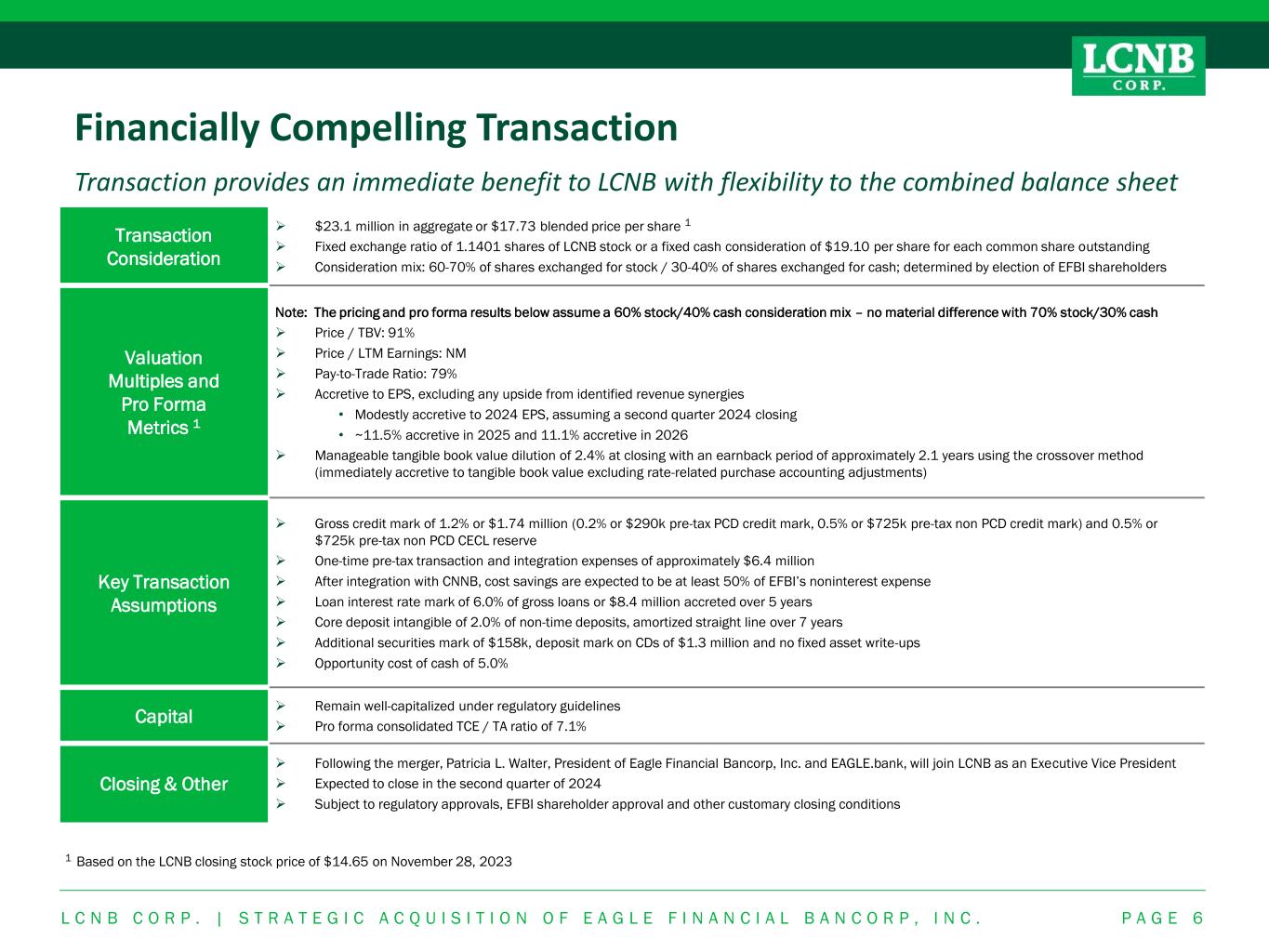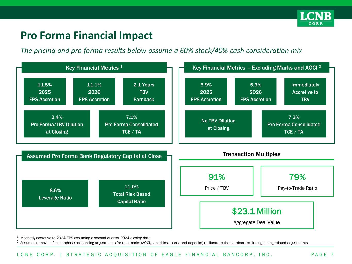 Financially Compelling Transaction Transaction provides an immediate benefit to LCNB with flexibility to the combined balance sheet P A G E 6 Transaction Consideration ➢ $23.1 million in aggregate or $17.73 blended price per share 1 ➢ Fixed exchange ratio of 1.1401 shares of LCNB stock or a fixed cash consideration of $19.10 per share for each common share outstanding ➢ Consideration mix: 60-70% of shares exchanged for stock / 30-40% of shares exchanged for cash; determined by election of EFBI shareholders Valuation Multiples and Pro Forma Metrics 1 Note: The pricing and pro forma results below assume a 60% stock/40% cash consideration mix – no material difference with 70% stock/30% cash ➢ Price / TBV: 91% ➢ Price / LTM Earnings: NM ➢ Pay-to-Trade Ratio: 79% ➢ Accretive to EPS, excluding any upside from identified revenue synergies • Modestly accretive to 2024 EPS, assuming a second quarter 2024 closing • ~11.5% accretive in 2025 and 11.1% accretive in 2026 ➢ Manageable tangible book value dilution of 2.4% at closing with an earnback period of approximately 2.1 years using the crossover method (immediately accretive to tangible book value excluding rate-related purchase accounting adjustments) Key Transaction Assumptions ➢ Gross credit mark of 1.2% or $1.74 million (0.2% or $290k pre-tax PCD credit mark, 0.5% or $725k pre-tax non PCD credit mark) and 0.5% or $725k pre-tax non PCD CECL reserve ➢ One-time pre-tax transaction and integration expenses of approximately $6.4 million ➢ After integration with CNNB, cost savings are expected to be at least 50% of EFBI’s noninterest expense ➢ Loan interest rate mark of 6.0% of gross loans or $8.4 million accreted over 5 years ➢ Core deposit intangible of 2.0% of non-time deposits, amortized straight line over 7 years ➢ Additional securities mark of $158k, deposit mark on CDs of $1.3 million and no fixed asset write-ups ➢ Opportunity cost of cash of 5.0% Capital ➢ Remain well-capitalized under regulatory guidelines ➢ Pro forma consolidated TCE / TA ratio of 7.1% Closing & Other ➢ Following the merger, Patricia L. Walter, President of Eagle Financial Bancorp, Inc. and EAGLE.bank, will join LCNB as an Executive Vice President ➢ Expected to close in the second quarter of 2024 ➢ Subject to regulatory approvals, EFBI shareholder approval and other customary closing conditions 1 Based on the LCNB closing stock price of $14.65 on November 28, 2023 L C N B C O R P . | S T R A T E G I C A C Q U I S I T I O N O F E A G L E F I N A N C I A L B A N C O R P , I N C .