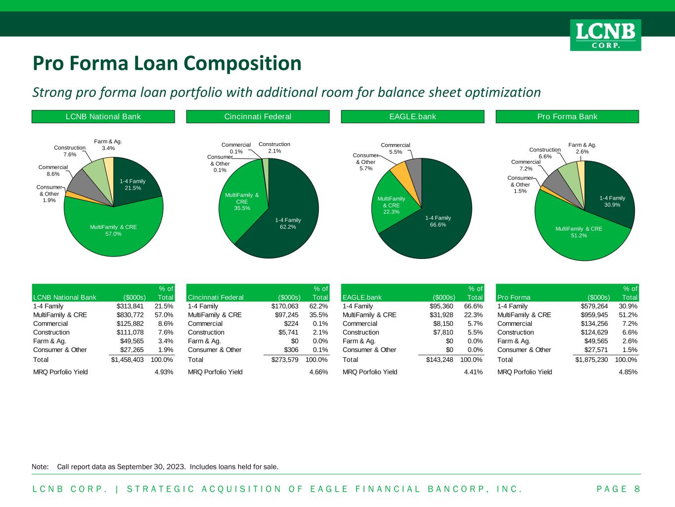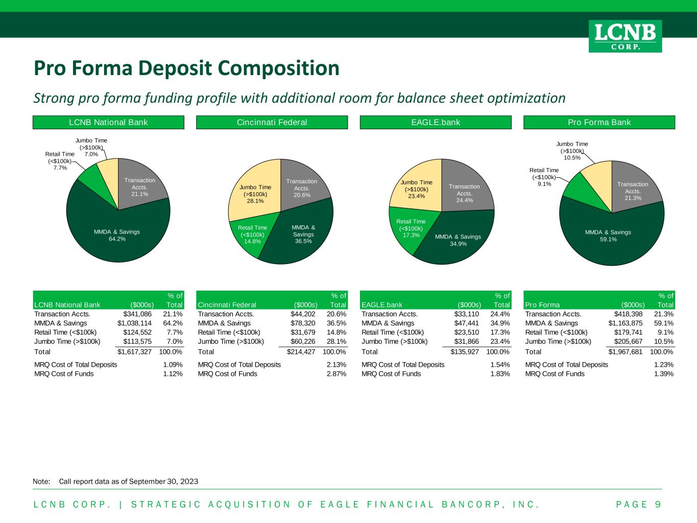 P A G E 8 Pro Forma Loan Composition Strong pro forma loan portfolio with additional room for balance sheet optimization Note: Call report data as September 30, 2023. Includes loans held for sale. L C N B C O R P . | S T R A T E G I C A C Q U I S I T I O N O F E A G L E F I N A N C I A L B A N C O R P , I N C . ($000s) % of Total Cincinnati Federal ($000s) % of Total EAGLE.bank ($000s) % of Total Pro Forma ($000s) % of Total 1-4 Family $313,841 21.5% 1-4 Family $170,063 62.2% 1-4 Family $95,360 66.6% 1-4 Family $579,264 30.9% MultiFamily & CRE $830,772 57.0% MultiFamily & CRE $97,245 35.5% MultiFamily & CRE $31,928 22.3% MultiFamily & CRE $959,945 51.2% Commercial $125,882 8.6% Commercial $224 0.1% Commercial $8,150 5.7% Commercial $134,256 7.2% Construction $111,078 7.6% Construction $5,741 2.1% Construction $7,810 5.5% Construction $124,629 6.6% Farm & Ag. $49,565 3.4% Farm & Ag. $0 0.0% Farm & Ag. $0 0.0% Farm & Ag. $49,565 2.6% Consumer & Other $27,265 1.9% Consumer & Other $306 0.1% Consumer & Other $0 0.0% Consumer & Other $27,571 1.5% Total $1,458,403 100.0% Total $273,579 100.0% Total $143,248 100.0% Total $1,875,230 100.0% MRQ Porfolio Yield 4.93% MRQ Porfolio Yield 4.66% MRQ Porfolio Yield 4.41% MRQ Porfolio Yield 4.85% LCNB National Bank LCNB National Bank Cincinnati Federal Pro Forma BankEAGLE.bank 1-4 Family 21.5% MultiFamily & CRE 57.0% Consumer & Other 1.9% Commercial 8.6% Construction 7.6% Farm & Ag. 3.4% 1-4 Family 62.2% MultiFamily & CRE 35.5% Consumer & Other 0.1% Commercial 0.1% Construction 2.1% 1-4 Family 66.6% MultiFamily & CRE 22.3% Consumer & Other 5.7% Commercial 5.5% 1-4 Family 30.9% MultiFamily & CRE 51.2% Consumer & Other 1.5% Commercial 7.2% Construction 6.6% Farm & Ag. 2.6%
