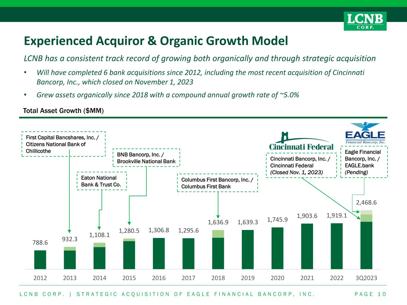 Pro Forma Deposit Composition Strong pro forma funding profile with additional room for balance sheet optimization P A G E 9 Note: Call report data as of September 30, 2023 L C N B C O R P . | S T R A T E G I C A C Q U I S I T I O N O F E A G L E F I N A N C I A L B A N C O R P , I N C . ($000s) % of Total Cincinnati Federal ($000s) % of Total EAGLE.bank ($000s) % of Total Pro Forma ($000s) % of Total Transaction Accts. $341,086 21.1% Transaction Accts. $44,202 20.6% Transaction Accts. $33,110 24.4% Transaction Accts. $418,398 21.3% MMDA & Savings $1,038,114 64.2% MMDA & Savings $78,320 36.5% MMDA & Savings $47,441 34.9% MMDA & Savings $1,163,875 59.1% Retail Time (<$100k) $124,552 7.7% Retail Time (<$100k) $31,679 14.8% Retail Time (<$100k) $23,510 17.3% Retail Time (<$100k) $179,741 9.1% Jumbo Time (>$100k) $113,575 7.0% Jumbo Time (>$100k) $60,226 28.1% Jumbo Time (>$100k) $31,866 23.4% Jumbo Time (>$100k) $205,667 10.5% Total $1,617,327 100.0% Total $214,427 100.0% Total $135,927 100.0% Total $1,967,681 100.0% MRQ Cost of Total Deposits 1.09% MRQ Cost of Total Deposits 2.13% MRQ Cost of Total Deposits 1.54% MRQ Cost of Total Deposits 1.23% MRQ Cost of Funds 1.12% MRQ Cost of Funds 2.87% MRQ Cost of Funds 1.83% MRQ Cost of Funds 1.39% LCNB National Bank LCNB National Bank Cincinnati Federal EAGLE.bank Pro Forma Bank Transaction Accts. 21.1% MMDA & Savings 64.2% Retail Time (<$100k) 7.7% Jumbo Time (>$100k) 7.0% Transaction Accts. 20.6% MMDA & Savings 36.5% Retail Time (<$100k) 14.8% Jumbo Time (>$100k) 28.1% Transaction Accts. 24.4% MMDA & Savings 34.9% Retail Time (<$100k) 17.3% Jumbo Time (>$100k) 23.4% Transaction Accts. 21.3% MMDA & Savings 59.1% Retail Time (<$100k) 9.1% Jumbo Time (>$100k) 10.5%