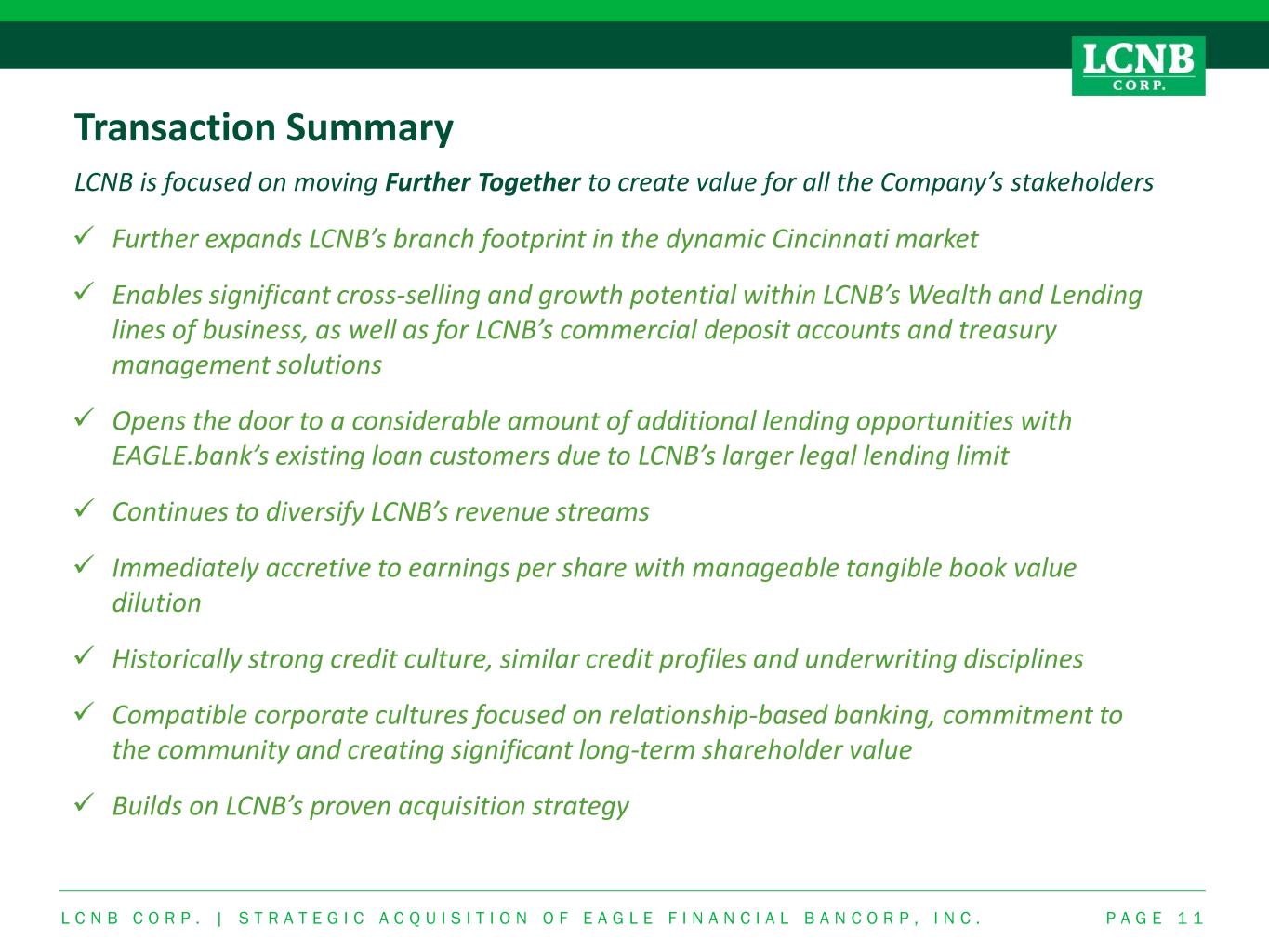 788.6 932.3 1,108.1 1,280.5 1,306.8 1,295.6 1,636.9 1,639.3 1,745.9 1,903.6 1,919.1 2,468.6 2012 2013 2014 2015 2016 2017 2018 2019 2020 2021 2022 3Q2023 P A G E 1 0 Experienced Acquiror & Organic Growth Model LCNB has a consistent track record of growing both organically and through strategic acquisition • Will have completed 6 bank acquisitions since 2012, including the most recent acquisition of Cincinnati Bancorp, Inc., which closed on November 1, 2023 • Grew assets organically since 2018 with a compound annual growth rate of ~5.0% First Capital Bancshares, Inc. / Citizens National Bank of Chillicothe Eaton National Bank & Trust Co. BNB Bancorp, Inc. / Brookville National Bank Columbus First Bancorp, Inc. / Columbus First Bank Total Asset Growth ($MM) Cincinnati Bancorp, Inc. / Cincinnati Federal (Closed Nov. 1, 2023) Eagle Financial Bancorp, Inc. / EAGLE.bank (Pending) L C N B C O R P . | S T R A T E G I C A C Q U I S I T I O N O F E A G L E F I N A N C I A L B A N C O R P , I N C .