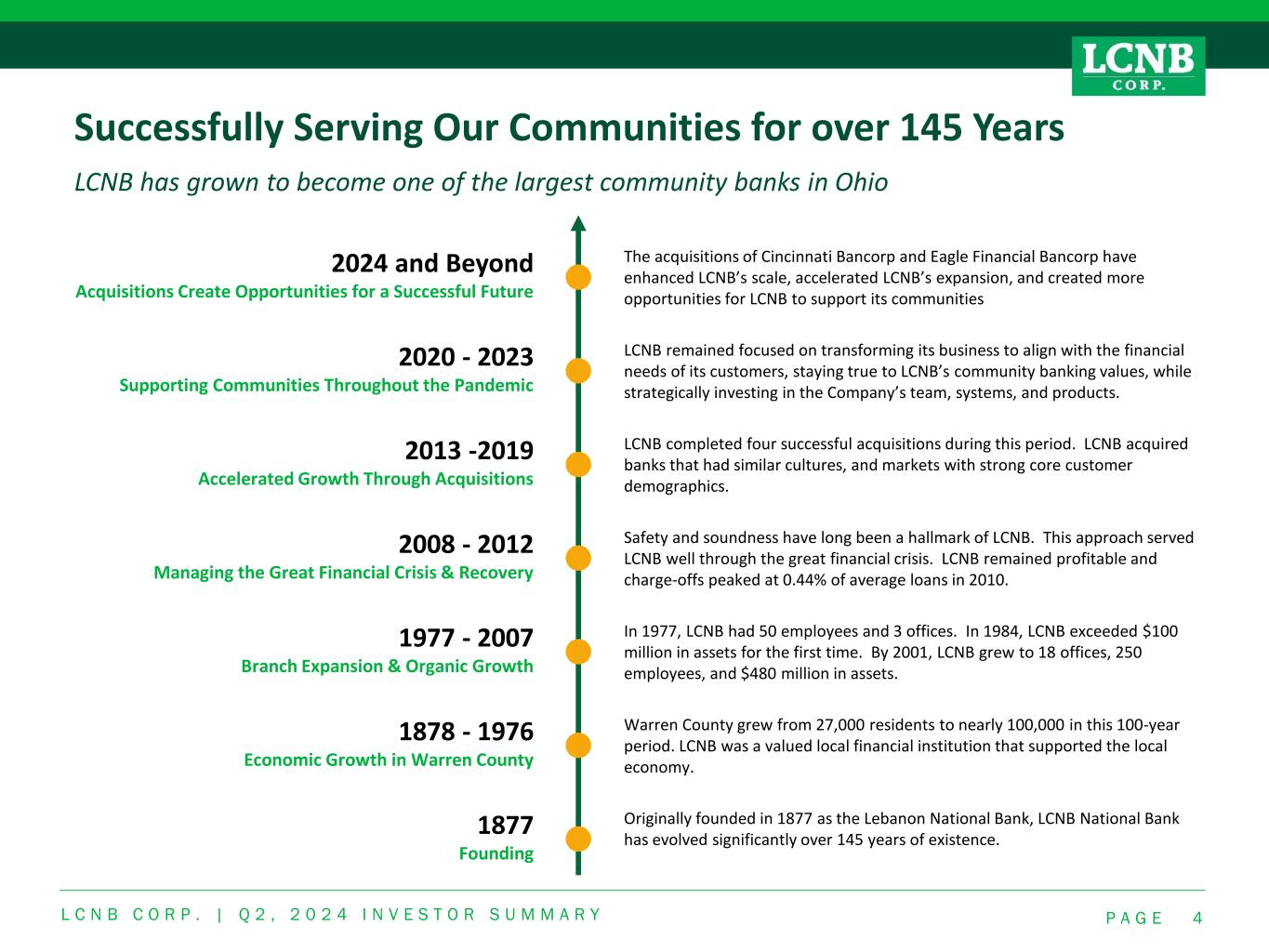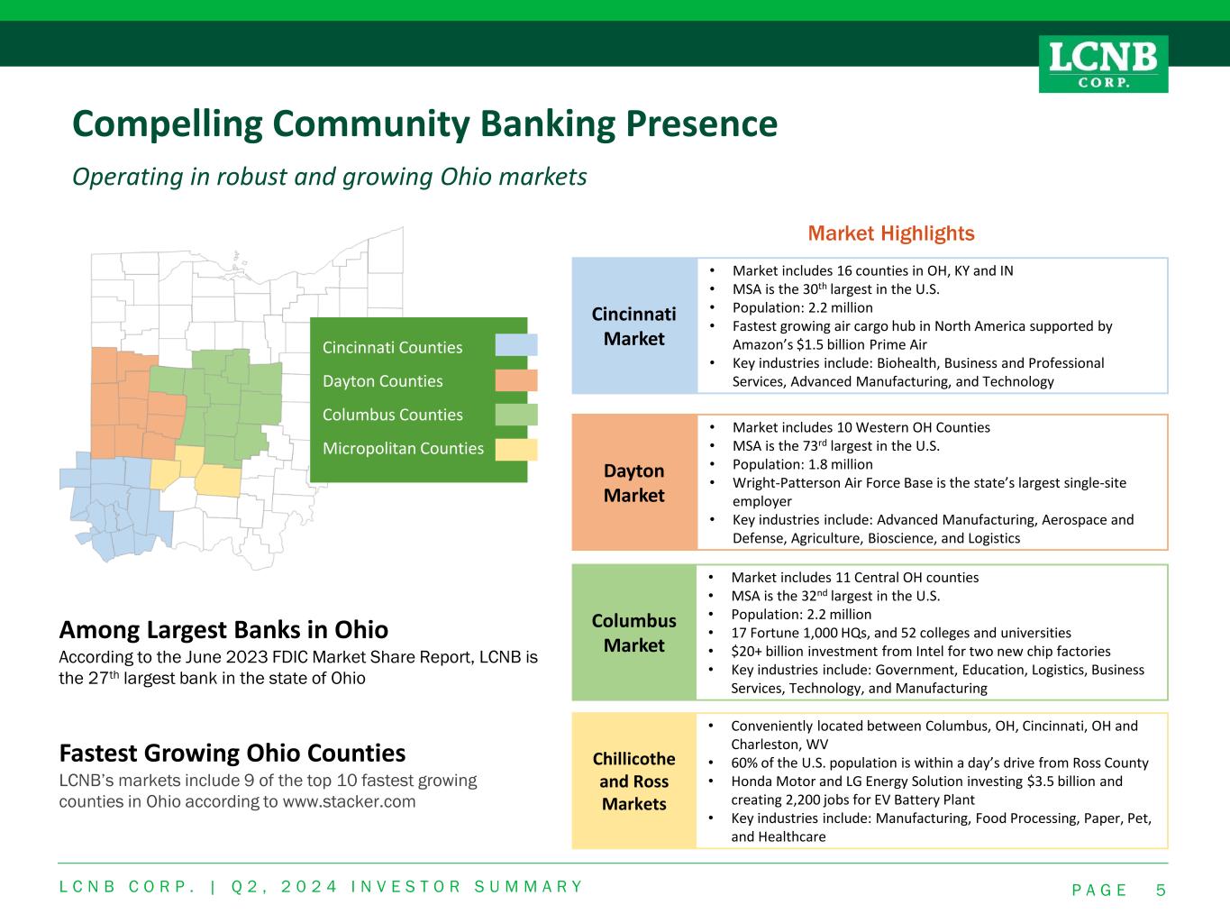 Successfully Serving Our Communities for over 145 Years LCNB has grown to become one of the largest community banks in Ohio 1877 Founding 1878 - 1976 Economic Growth in Warren County 1977 - 2007 Branch Expansion & Organic Growth 2008 - 2012 Managing the Great Financial Crisis & Recovery 2020 - 2023 Supporting Communities Throughout the Pandemic 2013 -2019 Accelerated Growth Through Acquisitions 2024 and Beyond Acquisitions Create Opportunities for a Successful Future Originally founded in 1877 as the Lebanon National Bank, LCNB National Bank has evolved significantly over 145 years of existence. Warren County grew from 27,000 residents to nearly 100,000 in this 100-year period. LCNB was a valued local financial institution that supported the local economy. In 1977, LCNB had 50 employees and 3 offices. In 1984, LCNB exceeded $100 million in assets for the first time. By 2001, LCNB grew to 18 offices, 250 employees, and $480 million in assets. LCNB completed four successful acquisitions during this period. LCNB acquired banks that had similar cultures, and markets with strong core customer demographics. LCNB remained focused on transforming its business to align with the financial needs of its customers, staying true to LCNB’s community banking values, while strategically investing in the Company’s team, systems, and products. Safety and soundness have long been a hallmark of LCNB. This approach served LCNB well through the great financial crisis. LCNB remained profitable and charge-offs peaked at 0.44% of average loans in 2010. The acquisitions of Cincinnati Bancorp and Eagle Financial Bancorp have enhanced LCNB’s scale, accelerated LCNB’s expansion, and created more opportunities for LCNB to support its communities L C N B C O R P . | Q 2 , 2 0 2 4 I N V E S T O R S U M M A R Y 4P A G E