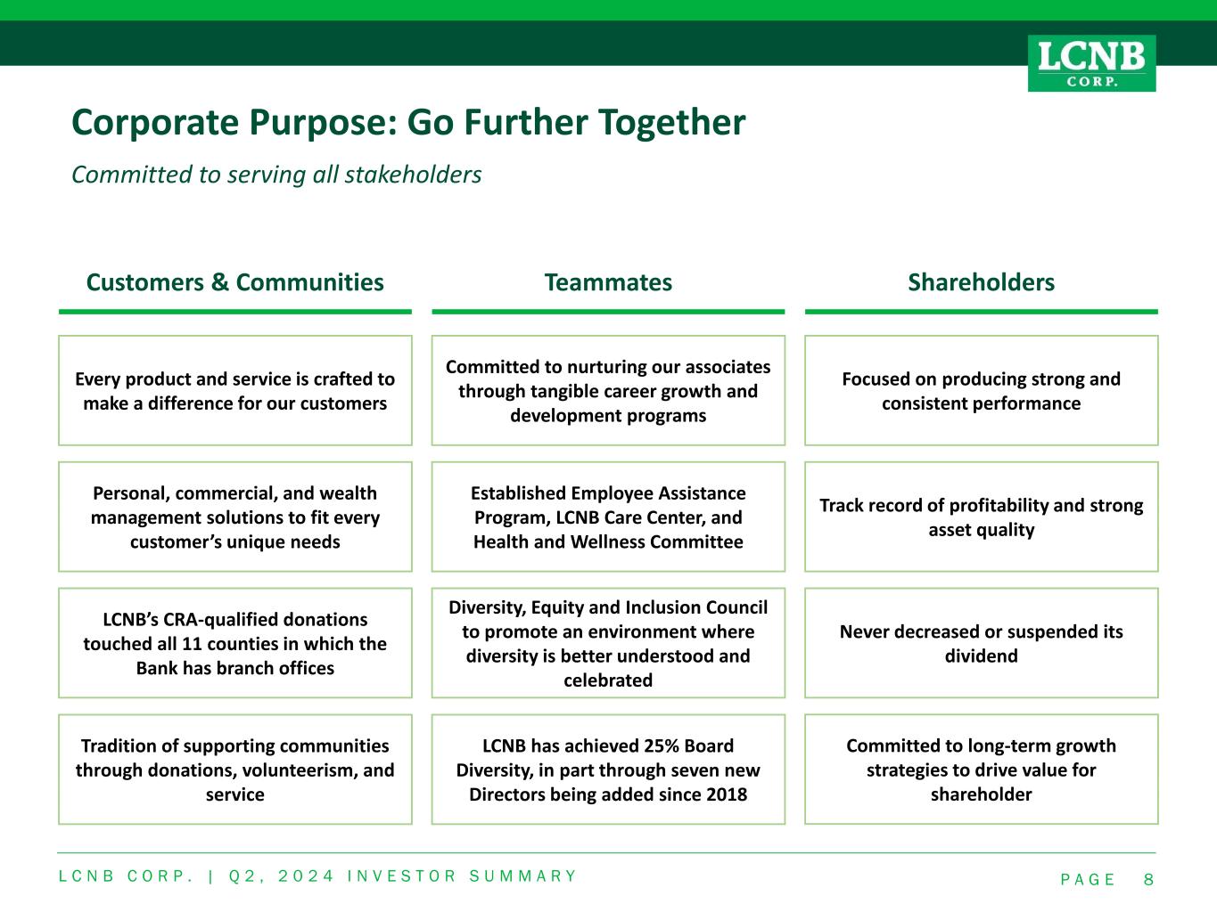 Compelling Scale One of the largest community banks in Ohio with $2.4 billion in total assets, and over 70,000 Personal, Business and Wealth customers Excellent Asset Quality Proven asset quality throughout multiple cycles, including the Great Financial Crisis and the global COVID-19 pandemic Where Does LCNB Stand Today? A proven platform that drives our history of strong operating and financial performance Pillars of Success Attractive Markets Over 30 bank offices in Southwestern and South-Central Ohio and Northern Kentucky representing fast growing markets with above average household incomes and favorable business landscape Experienced Leadership Leadership team has ~30-year average tenure within banking sector, and Board of Directors and Management Team are aligned on strategies underway to create long-term value Diverse Services Personal Banking, Business Banking, and Wealth Management support robust levels of noninterest income Strong Performance Compelling financial model has produced a 7.3% CAGR in adjusted net income from 2013 to 2023, which supports attractive dividend and share repurchase programs L C N B C O R P . | Q 2 , 2 0 2 4 I N V E S T O R S U M M A R Y 7P A G E