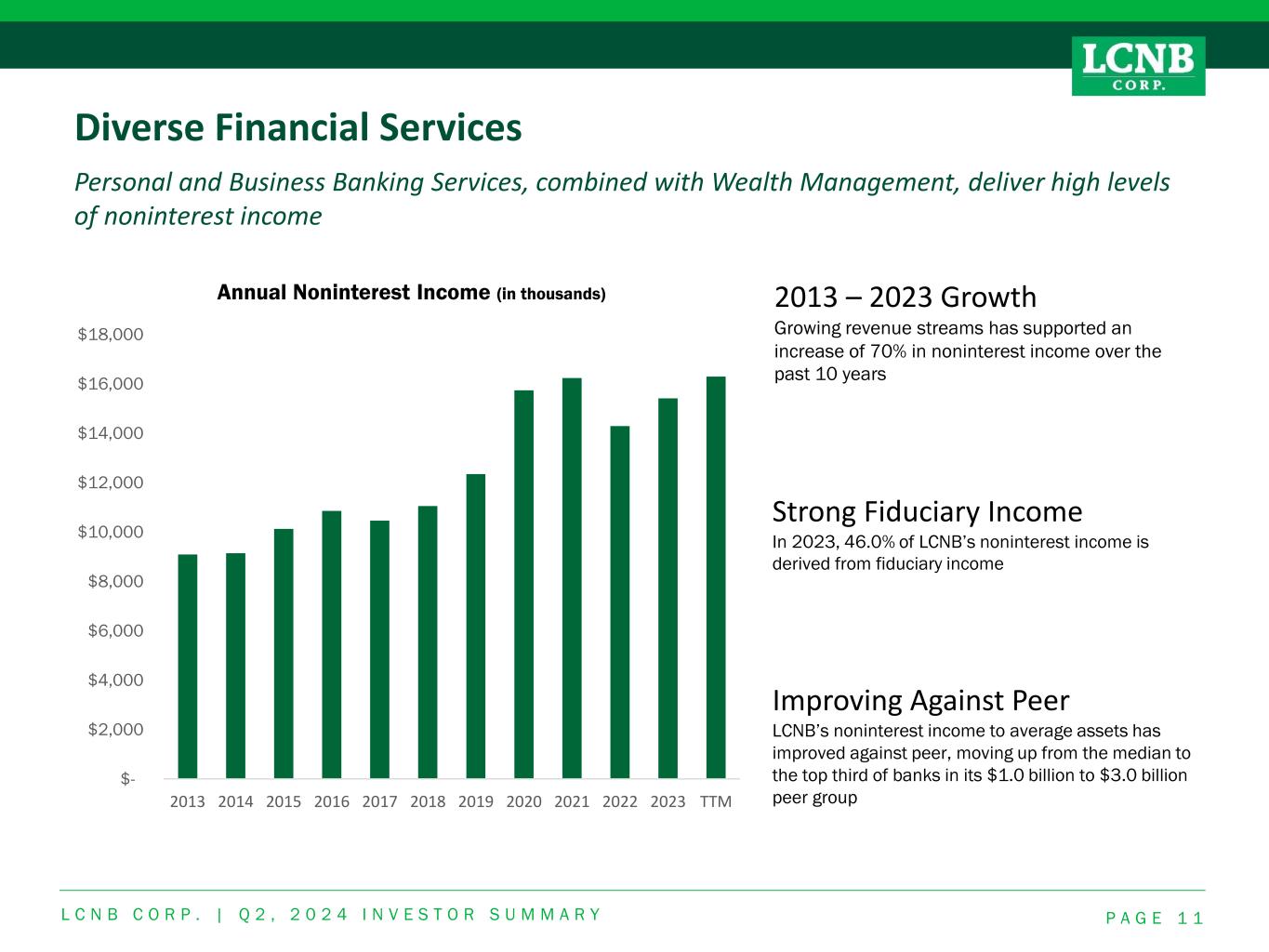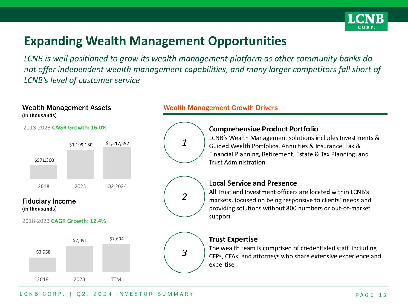 $571,300 $1,199,160 $1,317,392 2018 2023 Q2 2024 2018-2023 CAGR Growth: 16.0% $3,958 $7,091 $7,604 2018 2023 TTM 2018-2023 CAGR Growth: 12.4% Wealth Management Assets (in thousands) Fiduciary Income (in thousands) Expanding Wealth Management Opportunities LCNB is well positioned to grow its wealth management platform as other community banks do not offer independent wealth management capabilities, and many larger competitors fall short of LCNB’s level of customer service Wealth Management Growth Drivers Comprehensive Product Portfolio LCNB’s Wealth Management solutions includes Investments & Guided Wealth Portfolios, Annuities & Insurance, Tax & Financial Planning, Retirement, Estate & Tax Planning, and Trust Administration Local Service and Presence All Trust and Investment officers are located within LCNB’s markets, focused on being responsive to clients’ needs and providing solutions without 800 numbers or out-of-market support Trust Expertise The wealth team is comprised of credentialed staff, including CFPs, CFAs, and attorneys who share extensive experience and expertise 1 2 3 L C N B C O R P . | Q 2 , 2 0 2 4 I N V E S T O R S U M M A R Y 1 2P A G E