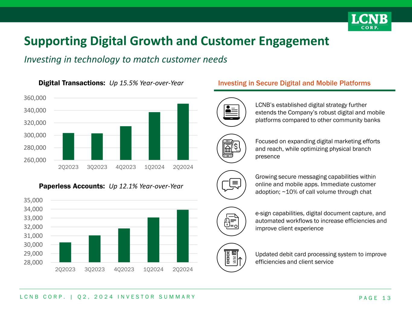 LCNB’s established digital strategy further extends the Company’s robust digital and mobile platforms compared to other community banks Digital Trends and Strategy Investing in Secure Digital and Mobile PlatformsDigital Transactions: Up 15.5% Year-over-Year 28,000 29,000 30,000 31,000 32,000 33,000 34,000 35,000 2Q2023 3Q2023 4Q2023 1Q2024 2Q2024 Paperless Accounts: Up 12.1% Year-over-Year Updated debit card processing system to improve efficiencies and client service Growing secure messaging capabilities within online and mobile apps. Immediate customer adoption; ~10% of call volume through chat e-sign capabilities, digital document capture, and automated workflows to increase efficiencies and improve client experience 260,000 280,000 300,000 320,000 340,000 360,000 2Q2023 3Q2023 4Q2023 1Q2024 2Q2024 Supporting Digital Growth and Customer Engagement Investing in technology to match customer needs Focused on expanding digital marketing efforts and reach, while optimizing physical branch presence L C N B C O R P . | Q 2 , 2 0 2 4 I N V E S T O R S U M M A R Y 1 3P A G E