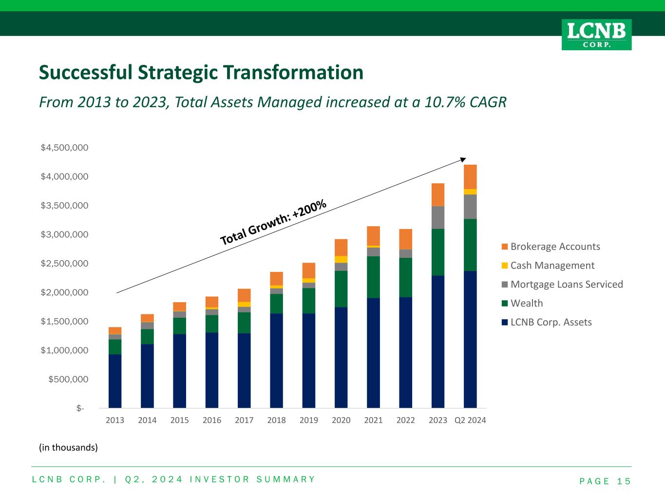 Digital Trends and Strategy Dedicated to Providing Responsive, Local and Leading Service Continual investments to drive productivity, while maintaining a superior level of service The Value of a Local and Responsive Bank “Our business is like an airline. It’s expensive whether we’re busy or not, and it’s particularly expensive to expand. The banking relationship is important for us. We need a flexible, responsible partner, and LCNB has proven to be exactly that.” (full testimonial) Sam Strotman, E-BEAM’s President & COO Continual Product Investments Provide modern banking solutions that fit customers' individual needs Optimize Branch Network Invest in modern, efficient, accessible and client focused offices Provide Superior Service via Local Bankers Provide communities with access to experienced bankers and ensure quick and local support L C N B C O R P . | Q 2 , 2 0 2 4 I N V E S T O R S U M M A R Y 1 4P A G E