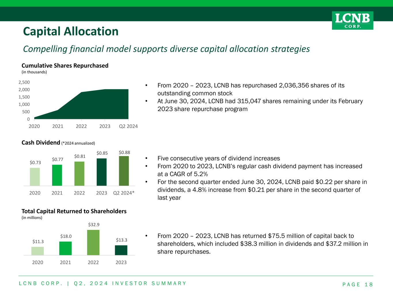 Total Assets ($ in billions) $1.95 $2.37 Q2 2023 Q2 2024 • Total assets reached a record of $2.37 billion • Loans, net increased 20.9% year-over-year to $1.73 billion, compared to $1.43 billion at June 30, 2023, primarily from the contribution of organic loan growth and the completion of the Cincinnati Federal and Eagle acquisitions • Total net loans increased 2.1% organically, or by $30.4 million, from the same period a year ago Nonperforming Assets to Total Assets 0.04% 0.13% Q2 2023 Q2 2024 EPS, Diluted • Total nonperforming loans, which includes non-accrual loans and loans past due 90 days or more and still accruing interest, increased to $3.0 million, or 0.17% of total loans at June 30, 2024, compared to $707,000 or 0.05% of total loans at June 30, 2023 • The year-over-year increase in nonaccrual loans was primarily due to one CRE relationship, representing a balance of $2.6 million • One-time operating expenses associated with the recent acquisitions has impacted LCNB’s historic levels of profitability • On a sequential basis, earnings per share have started to accelerate as the benefits of the acquisitions start to contribute to LCNB’s financial model 2024 Second Quarter Financial Highlights Excellent asset quality, and record total assets support compelling financial model $0.15 $0.07 $0.20 $0.29 Q1 2024 Q2 2024 GAAP Adjusted L C N B C O R P . | Q 2 , 2 0 2 4 I N V E S T O R S U M M A R Y 1 7P A G E