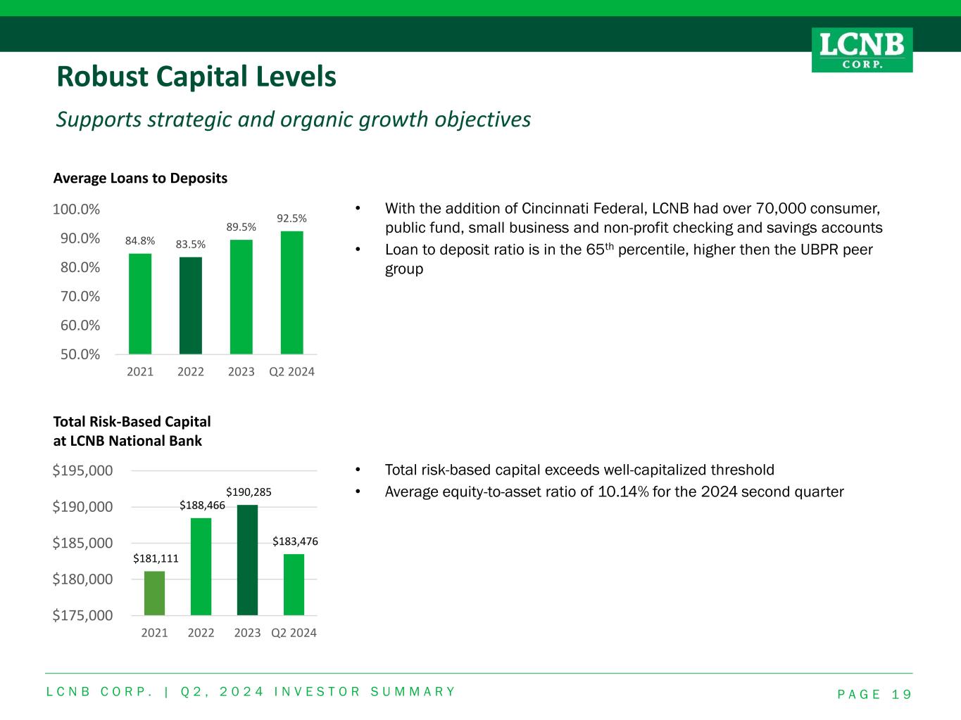 Cumulative Shares Repurchased (in thousands) • From 2020 – 2023, LCNB has repurchased 2,036,356 shares of its outstanding common stock • At June 30, 2024, LCNB had 315,047 shares remaining under its February 2023 share repurchase program Cash Dividend (*2024 annualized) $0.73 $0.77 $0.81 $0.85 $0.88 2020 2021 2022 2023 Q2 2024* • Five consecutive years of dividend increases • From 2020 to 2023, LCNB’s regular cash dividend payment has increased at a CAGR of 5.2% • For the second quarter ended June 30, 2024, LCNB paid $0.22 per share in dividends, a 4.8% increase from $0.21 per share in the second quarter of last year Capital Allocation Compelling financial model supports diverse capital allocation strategies L C N B C O R P . | Q 2 , 2 0 2 4 I N V E S T O R S U M M A R Y 1 8P A G E 0 500 1,000 1,500 2,000 2,500 2020 2021 2022 2023 Q2 2024 • From 2020 – 2023, LCNB has returned $75.5 million of capital back to shareholders, which included $38.3 million in dividends and $37.2 million in share repurchases. $11.3 $18.0 $32.9 $13.3 2020 2021 2022 2023 Total Capital Returned to Shareholders (in millions)