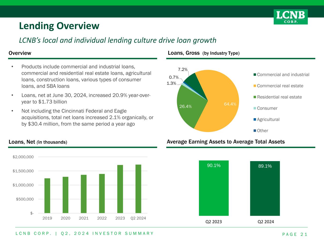 • Off balance sheet insured cash sweep program • Total deposits increased 21.7% year-over-year to $1.94 billion, and increased 6.8% organically • Noninterest-bearing stood at 23.1% of total deposits • Cost of interest-bearing demand and money market deposits were 2.22% • LCNB’s core deposits as a percentage of total assets is in the top third of its $1 – $3 billion bank peer group • Cost of total interest-bearing deposits was 2.57%, which is better than LCNB’s peer group Overview (at June 30, 2024) Deposit Trends (in thousands) Core Deposits to Total Deposits Deposit Performance Prudent management of local and stable deposit base $- $200,000 $400,000 $600,000 $800,000 $1,000,000 $1,200,000 $1,400,000 $1,600,000 $1,800,000 $2,000,000 2019 2020 2021 2022 2023 Q2 2024 Interest Bearing Noninterest Bearing 96.5% 97.6% 98.5% 99.0% 97.6% 94.7% 2019 2020 2021 2022 2023 Q2 2024 L C N B C O R P . | Q 2 , 2 0 2 4 I N V E S T O R S U M M A R Y 2 0P A G E