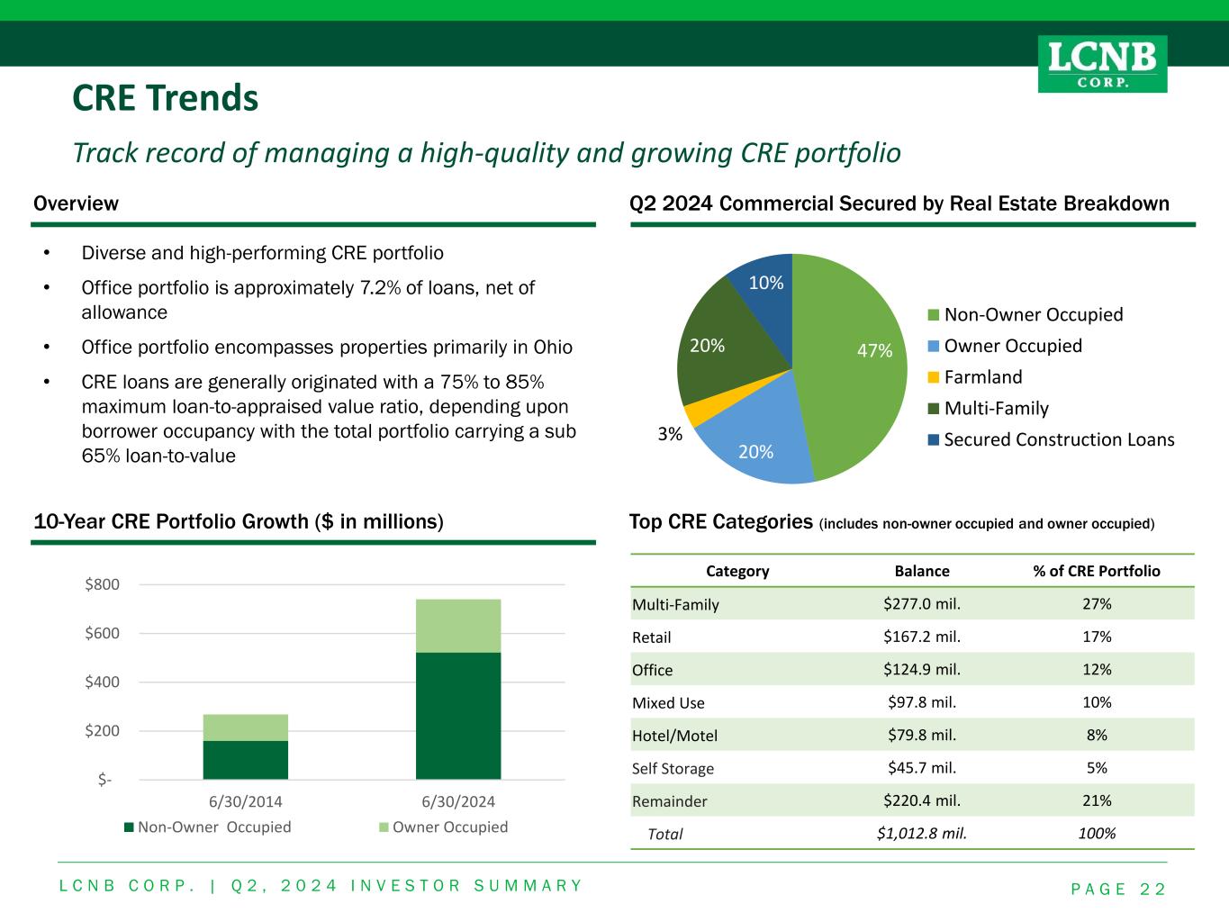 7.2% 64.4% 26.4% 1.3% 0.7% Commercial and industrial Commercial real estate Residential real estate Consumer Agricultural Other • Products include commercial and industrial loans, commercial and residential real estate loans, agricultural loans, construction loans, various types of consumer loans, and SBA loans • Loans, net at June 30, 2024, increased 20.9% year-over- year to $1.73 billion • Not including the Cincinnati Federal and Eagle acquisitions, total net loans increased 2.1% organically, or by $30.4 million, from the same period a year ago Overview Loans, Gross (by Industry Type) Average Earning Assets to Average Total AssetsLoans, Net (in thousands) $- $500,000 $1,000,000 $1,500,000 $2,000,000 2019 2020 2021 2022 2023 Q2 2024 90.1% 89.1% Lending Overview LCNB’s local and individual lending culture drive loan growth Q2 2023 Q2 2024 L C N B C O R P . | Q 2 , 2 0 2 4 I N V E S T O R S U M M A R Y 2 1P A G E