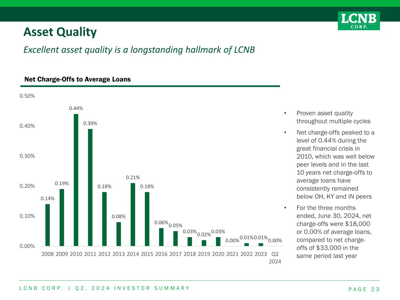 Q2 2024 Commercial Secured by Real Estate Breakdown Top CRE Categories (includes non-owner occupied and owner occupied) 47% 20% 3% 20% 10% Non-Owner Occupied Owner Occupied Farmland Multi-Family Secured Construction Loans Category Balance % of CRE Portfolio Multi-Family $277.0 mil. 27% Retail $167.2 mil. 17% Office $124.9 mil. 12% Mixed Use $97.8 mil. 10% Hotel/Motel $79.8 mil. 8% Self Storage $45.7 mil. 5% Remainder $220.4 mil. 21% Total $1,012.8 mil. 100% 10-Year CRE Portfolio Growth ($ in millions) Overview $- $200 $400 $600 $800 6/30/2014 6/30/2024 Non-Owner Occupied Owner Occupied • Diverse and high-performing CRE portfolio • Office portfolio is approximately 7.2% of loans, net of allowance • Office portfolio encompasses properties primarily in Ohio • CRE loans are generally originated with a 75% to 85% maximum loan-to-appraised value ratio, depending upon borrower occupancy with the total portfolio carrying a sub 65% loan-to-value CRE Trends Track record of managing a high-quality and growing CRE portfolio L C N B C O R P . | Q 2 , 2 0 2 4 I N V E S T O R S U M M A R Y 2 2P A G E