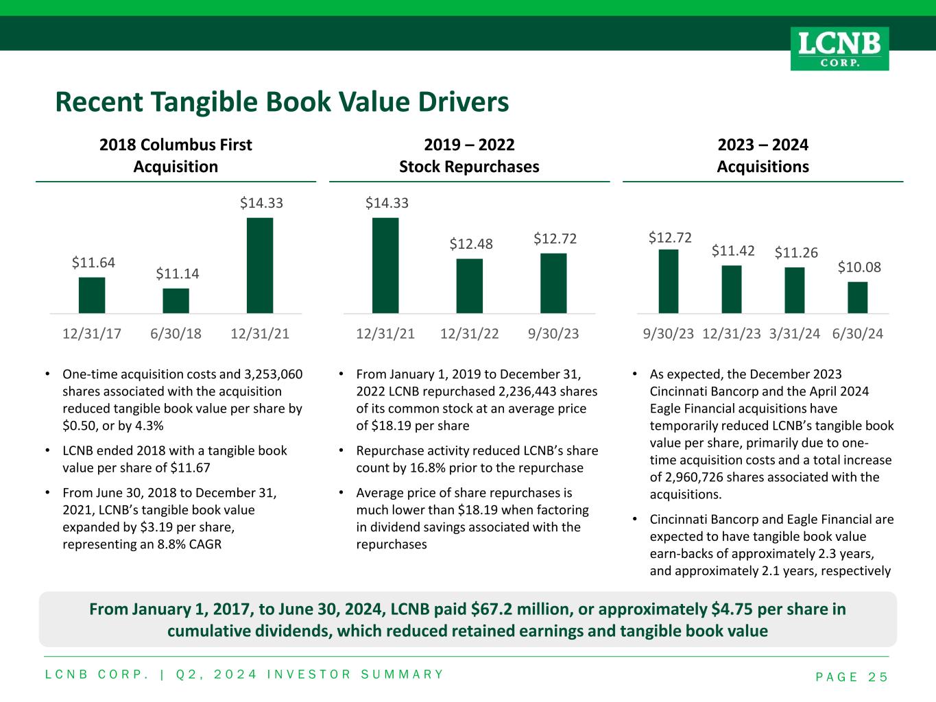 Net Interest Income After Provision for Credit Losses, Annually Annual Diluted EPS $- $5,000 $10,000 $15,000 $20,000 $25,000 2018 2019 2020 2021 2022 2023 Annual Net Income • 2023 profitability impacted primarily by one-time acquisition related operating and provision expenses and higher interest expense • Core profitability remains solid and supported by record annual non-interest income • Strong adjusted full year returns at December 31, 2023: ‒ Adjusted return on average equity: 8.58% ‒ Adjusted return on average assets: 0.89% Focused on Maintaining Strong Profitability $- $0.50 $1.00 $1.50 $2.00 $2.50 2018 2019 2020 2021 2022 2023 $- $10,000 $20,000 $30,000 $40,000 $50,000 $60,000 $70,000 2018 2019 2020 2021 2022 2023 Annual Earnings Growth (charts in thousands, expect annual diluted EPS) LCNB has a history of high levels of profitability and strong earnings growth 2023 adjusted net income included $5.2 million of one-time merger related costs 2023 adjusted EPS included $0.46 of one-time merger related costs L C N B C O R P . | Q 2 , 2 0 2 4 I N V E S T O R S U M M A R Y 2 4P A G E