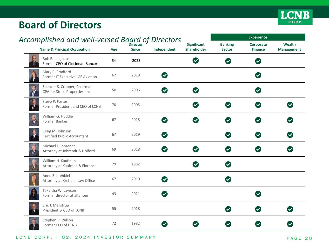 Name & Principal Occupation Age Director Since Independent Significant Shareholder Banking Sector Corporate Finance Wealth Management Bob Bedinghaus Former CEO of Cincinnati Bancorp Mary E. Bradford Former IT Executive, GE Aviation 67 2018 Spencer S. Cropper, Chairman CPA for Stolle Properties, Inc 50 2006 Steve P. Foster Former President and CEO of LCNB 70 2005 William G. Huddle Former Banker 67 2018 Craig M. Johnson Certified Public Accountant 67 2019 Michael J. Johrendt Attorney at Johrendt & Holford 69 2018 William H. Kaufman Attorney at Kaufman & Florence 79 1982 Anne E. Krehbiel Attorney at Krehbiel Law Office 67 2010 Takeitha W. Lawson Former director at altafiber 43 2021 Eric J. Meilstrup President & CEO of LCNB 55 2018 Stephen P. Wilson Former CEO of LCNB 72 1982 Experience Board of Directors Accomplished and well-versed Board of Directors 64 2023 L C N B C O R P . | Q 2 , 2 0 2 4 I N V E S T O R S U M M A R Y 2 8P A G E