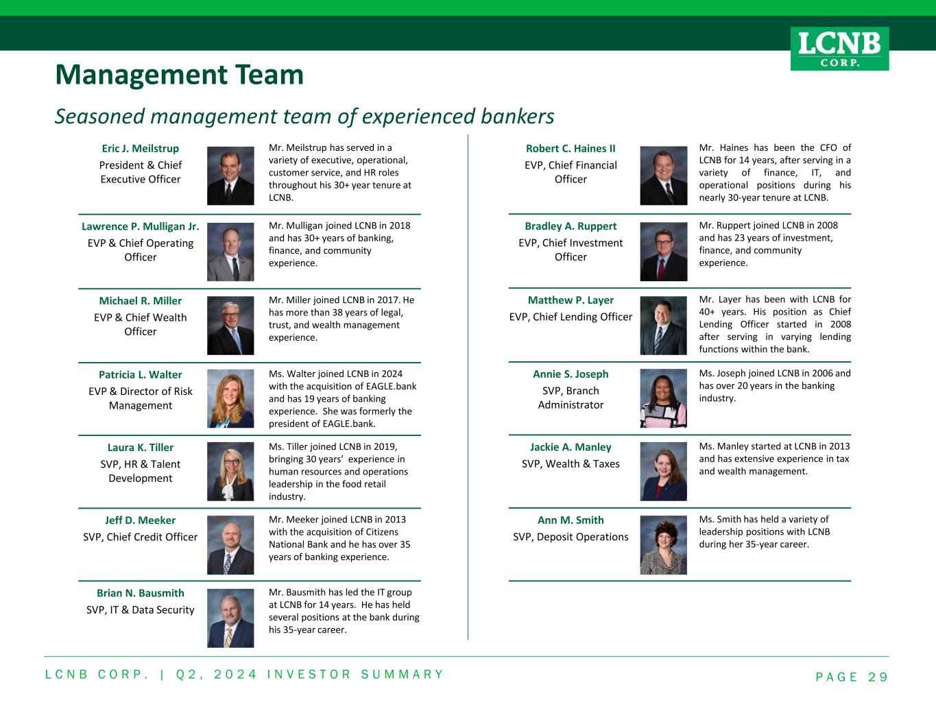 Robert C. Haines II EVP, Chief Financial Officer Mr. Haines has been the CFO of LCNB for 14 years, after serving in a variety of finance, IT, and operational positions during his nearly 30-year tenure at LCNB. Bradley A. Ruppert EVP, Chief Investment Officer Mr. Ruppert joined LCNB in 2008 and has 23 years of investment, finance, and community experience. Matthew P. Layer EVP, Chief Lending Officer Mr. Layer has been with LCNB for 40+ years. His position as Chief Lending Officer started in 2008 after serving in varying lending functions within the bank. Annie S. Joseph SVP, Branch Administrator Ms. Joseph joined LCNB in 2006 and has over 20 years in the banking industry. Jackie A. Manley SVP, Wealth & Taxes Ms. Manley started at LCNB in 2013 and has extensive experience in tax and wealth management. Ann M. Smith SVP, Deposit Operations Ms. Smith has held a variety of leadership positions with LCNB during her 35-year career. Eric J. Meilstrup President & Chief Executive Officer Mr. Meilstrup has served in a variety of executive, operational, customer service, and HR roles throughout his 30+ year tenure at LCNB. Lawrence P. Mulligan Jr. EVP & Chief Operating Officer Mr. Mulligan joined LCNB in 2018 and has 30+ years of banking, finance, and community experience. Michael R. Miller EVP & Chief Wealth Officer Mr. Miller joined LCNB in 2017. He has more than 38 years of legal, trust, and wealth management experience. Patricia L. Walter EVP & Director of Risk Management Ms. Walter joined LCNB in 2024 with the acquisition of EAGLE.bank and has 19 years of banking experience. She was formerly the president of EAGLE.bank. Laura K. Tiller SVP, HR & Talent Development Ms. Tiller joined LCNB in 2019, bringing 30 years’ experience in human resources and operations leadership in the food retail industry. Jeff D. Meeker SVP, Chief Credit Officer Mr. Meeker joined LCNB in 2013 with the acquisition of Citizens National Bank and he has over 35 years of banking experience. Brian N. Bausmith SVP, IT & Data Security Mr. Bausmith has led the IT group at LCNB for 14 years. He has held several positions at the bank during his 35-year career. Management Team Seasoned management team of experienced bankers L C N B C O R P . | Q 2 , 2 0 2 4 I N V E S T O R S U M M A R Y 2 9P A G E