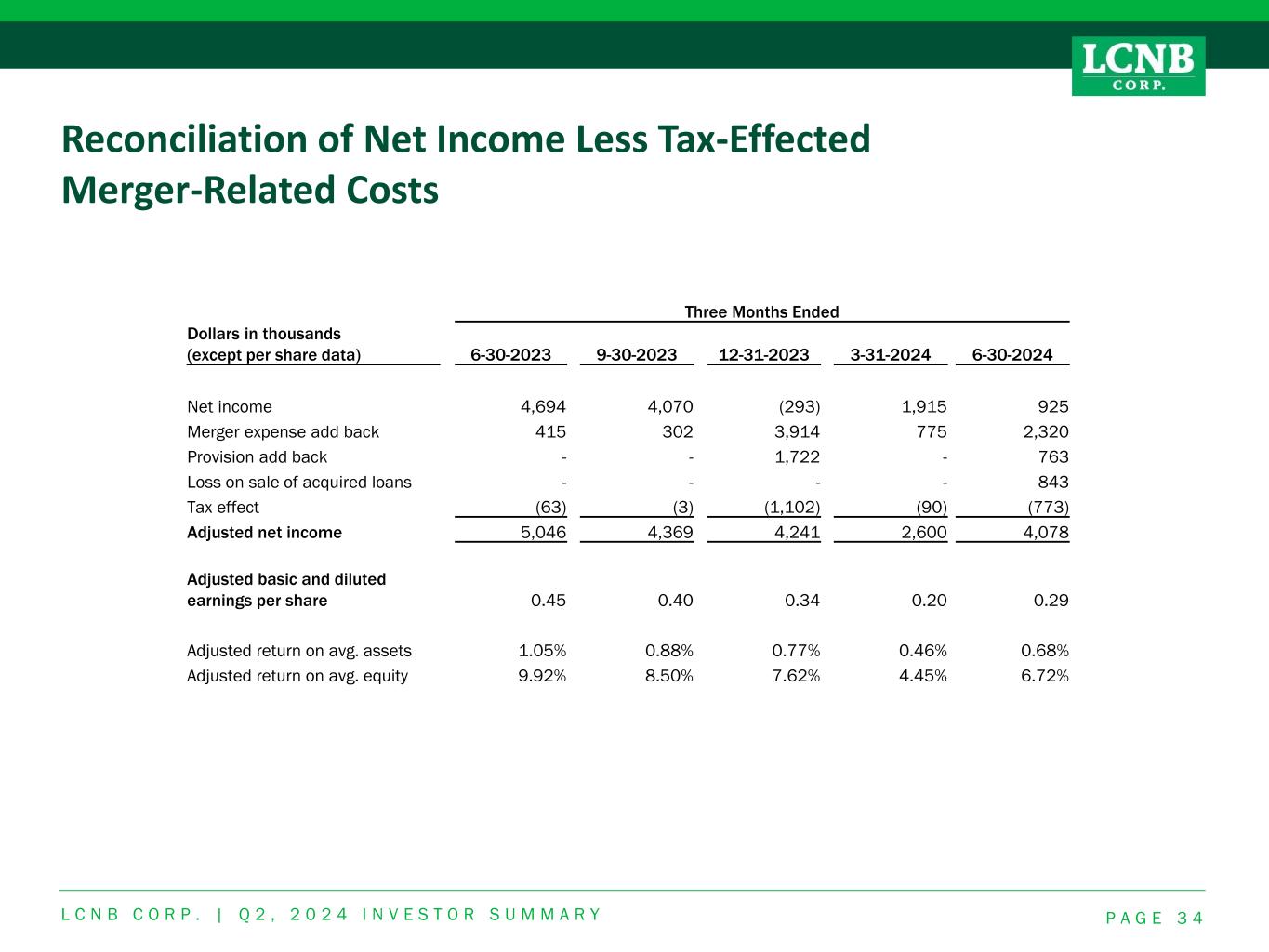 Quarterly Financials Quarterly Financials Dollars in thousands (except per share data) Q2 2023 Q3 2023 Q4 2023 Q1 2024 Q2 2024 Net interest income 14,177 13,571 14,659 13,895 15,217 Provision for (recovery of) for credit losses 30 (114) 2,218 125 528 Noninterest income 3,646 3,578 4,606 3,929 4,080 Noninterest expense 12,078 12,244 17,576 15,472 17,825 Income before income taxes 5,715 5,019 (529) 2,227 944 Income taxes 1,021 949 (236) 312 19 Net income 4,694 4,070 (293) 1,915 925 Net interest margin 3.28% 3.04% 2.99% 2.72% 2.86% Fee Income/Total Income 16.31% 15.39% 16.50% 13.70% 13.43% Total assets 1,950,763 1,981,668 2,291,592 2,283,151 2,371,313 Loans, net 1,431,295 1,450,472 1,712,946 1,645,797 1,725,477 Total deposits 1,596,709 1,616,890 1,824,389 1,858,493 1,943,060 Book value per share 18.20 18.10 17.86 17.67 17.33 Tangible book value per share 12.81 12.72 11.42 11.26 10.08 Earnings per share, diluted 0.42 0.37 (0.02) 0.15 0.07 Cash dividend (per share) 0.21 0.21 0.22 0.22 0.22 Dividend pay-out ratio 50.00% 56.76% NM 146.67% 314.29% Return on average assets 0.98% 0.82% (0.05)% 0.34% 0.15% Return on average tangible equity 13.07% 11.21% (O.72)% 4.39% 2.02% L C N B C O R P . | Q 2 , 2 0 2 4 I N V E S T O R S U M M A R Y 3 3P A G E