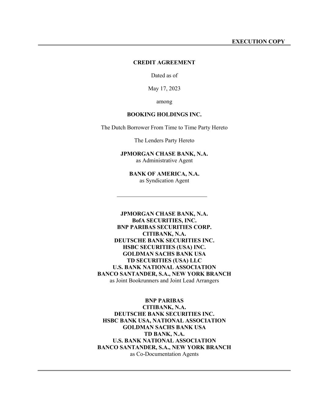 EXECUTION COPY CREDIT AGREEMENT Dated as of May 17, 2023 among BOOKING HOLDINGS INC. The Dutch Borrower From Time to Time Party Hereto The Lenders Party Hereto JPMORGAN CHASE BANK, N.A. as Administrative Agent BANK OF AMERICA, N.A. as Syndication Agent JPMORGAN CHASE BANK, N.A. BofA SECURITIES, INC. BNP PARIBAS SECURITIES CORP. CITIBANK, N.A. DEUTSCHE BANK SECURITIES INC. HSBC SECURITIES (USA) INC. GOLDMAN SACHS BANK USA TD SECURITIES (USA) LLC U.S. BANK NATIONAL ASSOCIATION BANCO SANTANDER, S.A., NEW YORK BRANCH as Joint Bookrunners and Joint Lead Arrangers BNP PARIBAS CITIBANK, N.A. DEUTSCHE BANK SECURITIES INC. HSBC BANK USA, NATIONAL ASSOCIATION GOLDMAN SACHS BANK USA TD BANK, N.A. U.S. BANK NATIONAL ASSOCIATION BANCO SANTANDER, S.A., NEW YORK BRANCH as Co-Documentation Agents