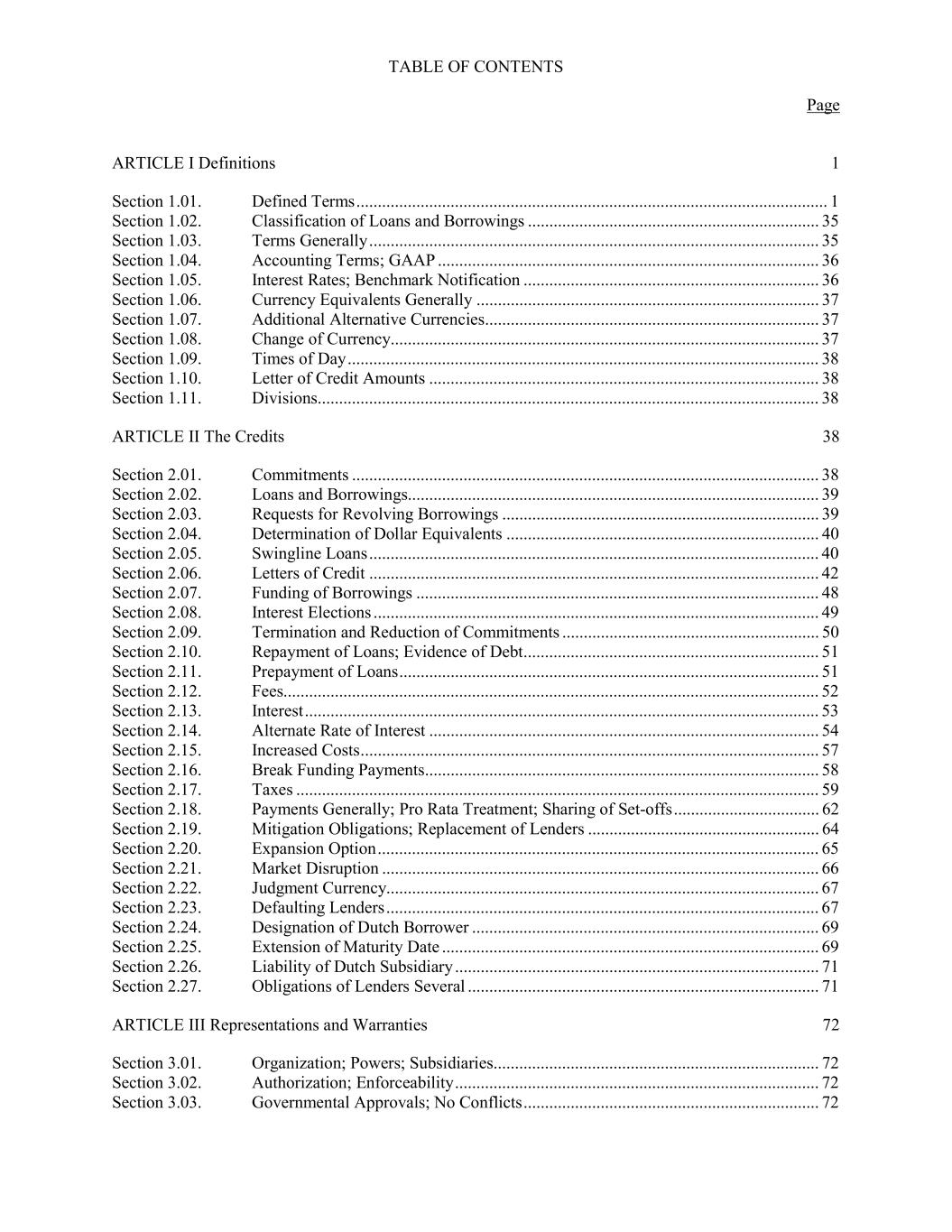 TABLE OF CONTENTS Page ARTICLE I Definitions 1 Section 1.01. Defined Terms .............................................................................................................. 1 Section 1.02. Classification of Loans and Borrowings .................................................................... 35 Section 1.03. Terms Generally ......................................................................................................... 35 Section 1.04. Accounting Terms; GAAP ......................................................................................... 36 Section 1.05. Interest Rates; Benchmark Notification ..................................................................... 36 Section 1.06. Currency Equivalents Generally ................................................................................ 37 Section 1.07. Additional Alternative Currencies .............................................................................. 37 Section 1.08. Change of Currency.................................................................................................... 37 Section 1.09. Times of Day .............................................................................................................. 38 Section 1.10. Letter of Credit Amounts ........................................................................................... 38 Section 1.11. Divisions ..................................................................................................................... 38 ARTICLE II The Credits 38 Section 2.01. Commitments ............................................................................................................. 38 Section 2.02. Loans and Borrowings................................................................................................ 39 Section 2.03. Requests for Revolving Borrowings .......................................................................... 39 Section 2.04. Determination of Dollar Equivalents ......................................................................... 40 Section 2.05. Swingline Loans ......................................................................................................... 40 Section 2.06. Letters of Credit ......................................................................................................... 42 Section 2.07. Funding of Borrowings .............................................................................................. 48 Section 2.08. Interest Elections ........................................................................................................ 49 Section 2.09. Termination and Reduction of Commitments ............................................................ 50 Section 2.10. Repayment of Loans; Evidence of Debt ..................................................................... 51 Section 2.11. Prepayment of Loans .................................................................................................. 51 Section 2.12. Fees............................................................................................................................. 52 Section 2.13. Interest ........................................................................................................................ 53 Section 2.14. Alternate Rate of Interest ........................................................................................... 54 Section 2.15. Increased Costs ........................................................................................................... 57 Section 2.16. Break Funding Payments............................................................................................ 58 Section 2.17. Taxes .......................................................................................................................... 59 Section 2.18. Payments Generally; Pro Rata Treatment; Sharing of Set-offs .................................. 62 Section 2.19. Mitigation Obligations; Replacement of Lenders ...................................................... 64 Section 2.20. Expansion Option ....................................................................................................... 65 Section 2.21. Market Disruption ...................................................................................................... 66 Section 2.22. Judgment Currency..................................................................................................... 67 Section 2.23. Defaulting Lenders ..................................................................................................... 67 Section 2.24. Designation of Dutch Borrower ................................................................................. 69 Section 2.25. Extension of Maturity Date ........................................................................................ 69 Section 2.26. Liability of Dutch Subsidiary ..................................................................................... 71 Section 2.27. Obligations of Lenders Several .................................................................................. 71 ARTICLE III Representations and Warranties 72 Section 3.01. Organization; Powers; Subsidiaries ............................................................................ 72 Section 3.02. Authorization; Enforceability ..................................................................................... 72 Section 3.03. Governmental Approvals; No Conflicts ..................................................................... 72