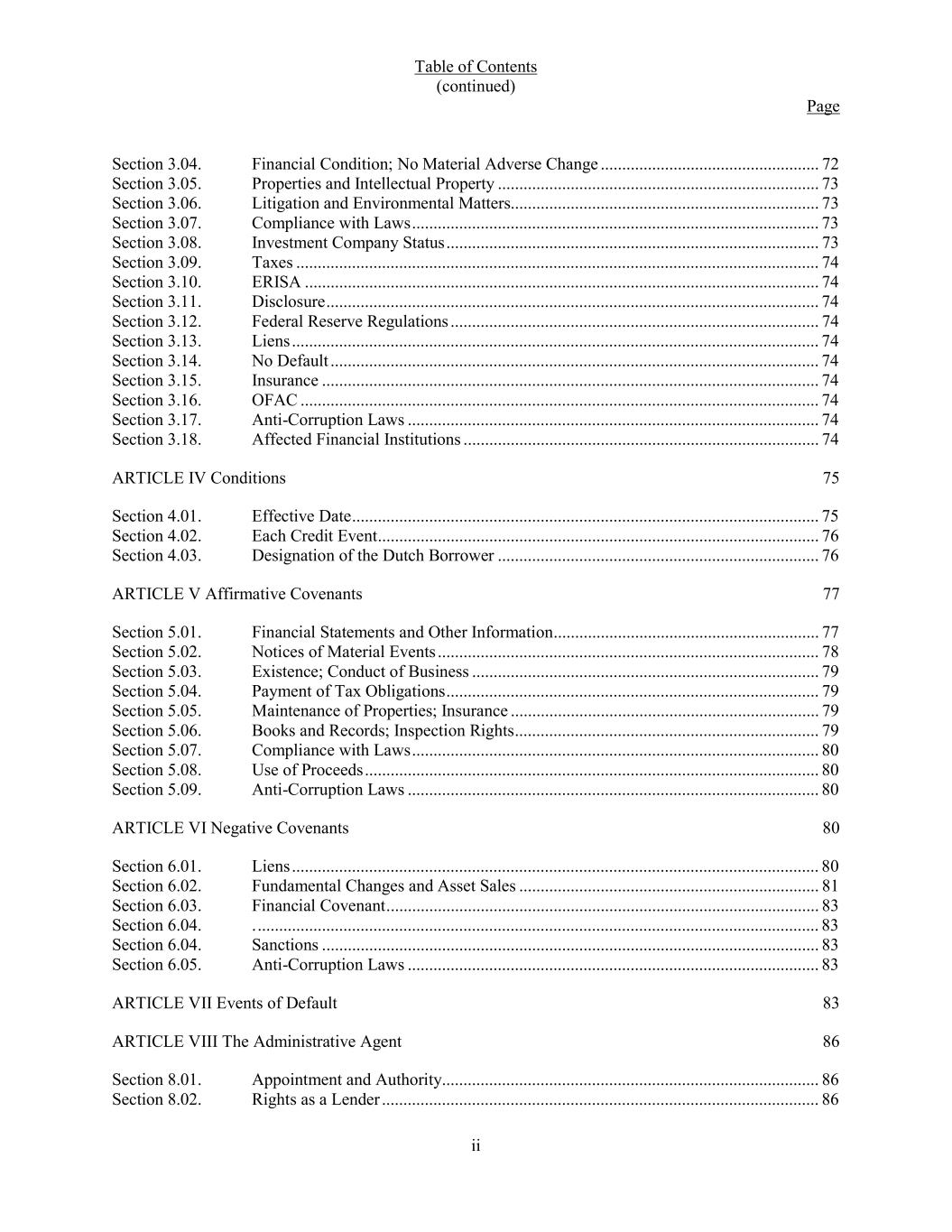 Table of Contents (continued) Page ii Section 3.04. Financial Condition; No Material Adverse Change ................................................... 72 Section 3.05. Properties and Intellectual Property ........................................................................... 73 Section 3.06. Litigation and Environmental Matters........................................................................ 73 Section 3.07. Compliance with Laws ............................................................................................... 73 Section 3.08. Investment Company Status ....................................................................................... 73 Section 3.09. Taxes .......................................................................................................................... 74 Section 3.10. ERISA ........................................................................................................................ 74 Section 3.11. Disclosure ................................................................................................................... 74 Section 3.12. Federal Reserve Regulations ...................................................................................... 74 Section 3.13. Liens ........................................................................................................................... 74 Section 3.14. No Default .................................................................................................................. 74 Section 3.15. Insurance .................................................................................................................... 74 Section 3.16. OFAC ......................................................................................................................... 74 Section 3.17. Anti-Corruption Laws ................................................................................................ 74 Section 3.18. Affected Financial Institutions ................................................................................... 74 ARTICLE IV Conditions 75 Section 4.01. Effective Date ............................................................................................................. 75 Section 4.02. Each Credit Event ....................................................................................................... 76 Section 4.03. Designation of the Dutch Borrower ........................................................................... 76 ARTICLE V Affirmative Covenants 77 Section 5.01. Financial Statements and Other Information .............................................................. 77 Section 5.02. Notices of Material Events ......................................................................................... 78 Section 5.03. Existence; Conduct of Business ................................................................................. 79 Section 5.04. Payment of Tax Obligations ....................................................................................... 79 Section 5.05. Maintenance of Properties; Insurance ........................................................................ 79 Section 5.06. Books and Records; Inspection Rights ....................................................................... 79 Section 5.07. Compliance with Laws ............................................................................................... 80 Section 5.08. Use of Proceeds .......................................................................................................... 80 Section 5.09. Anti-Corruption Laws ................................................................................................ 80 ARTICLE VI Negative Covenants 80 Section 6.01. Liens ........................................................................................................................... 80 Section 6.02. Fundamental Changes and Asset Sales ...................................................................... 81 Section 6.03. Financial Covenant ..................................................................................................... 83 Section 6.04. . ................................................................................................................................... 83 Section 6.04. Sanctions .................................................................................................................... 83 Section 6.05. Anti-Corruption Laws ................................................................................................ 83 ARTICLE VII Events of Default 83 ARTICLE VIII The Administrative Agent 86 Section 8.01. Appointment and Authority ........................................................................................ 86 Section 8.02. Rights as a Lender ...................................................................................................... 86