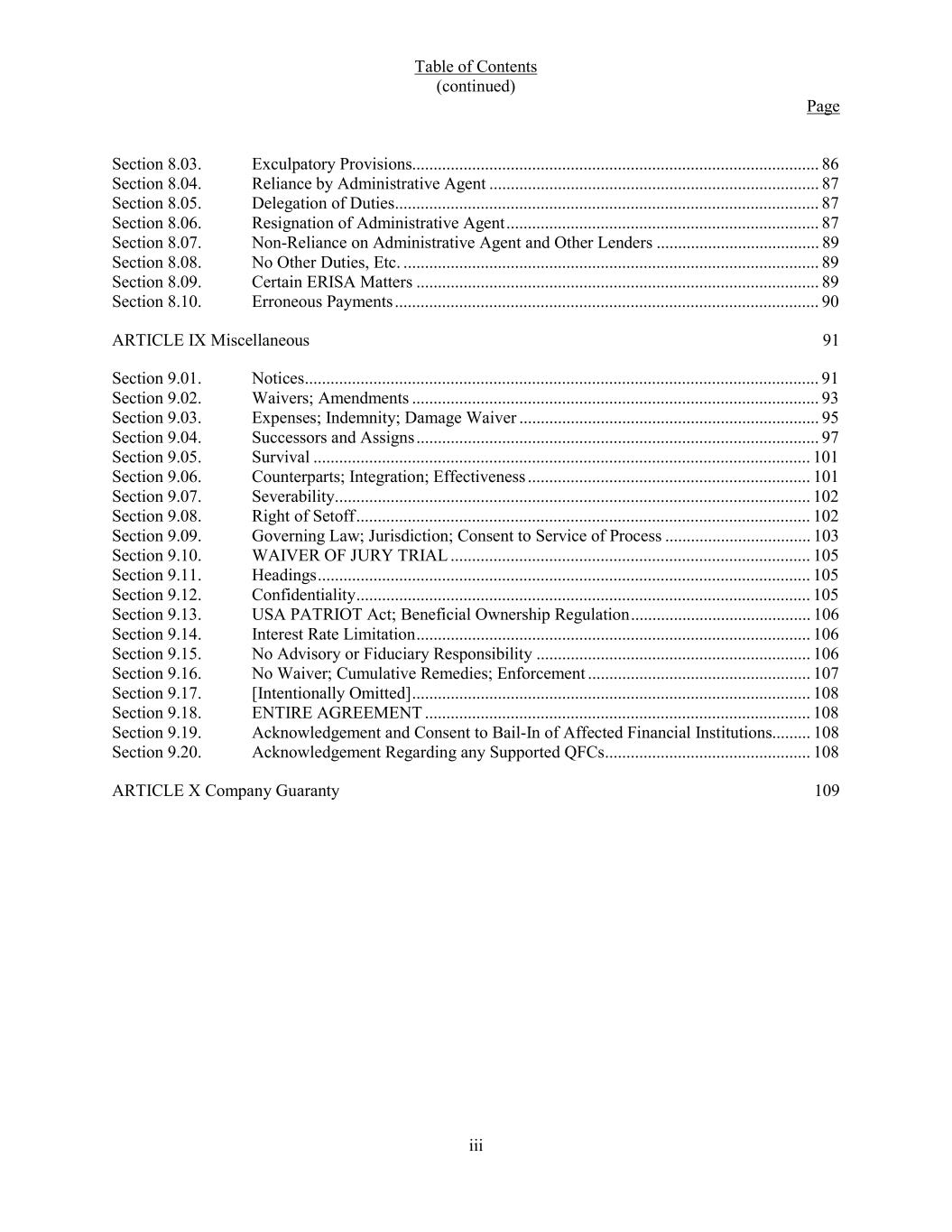 Table of Contents (continued) Page iii Section 8.03. Exculpatory Provisions............................................................................................... 86 Section 8.04. Reliance by Administrative Agent ............................................................................. 87 Section 8.05. Delegation of Duties ................................................................................................... 87 Section 8.06. Resignation of Administrative Agent ......................................................................... 87 Section 8.07. Non-Reliance on Administrative Agent and Other Lenders ...................................... 89 Section 8.08. No Other Duties, Etc. ................................................................................................. 89 Section 8.09. Certain ERISA Matters .............................................................................................. 89 Section 8.10. Erroneous Payments ................................................................................................... 90 ARTICLE IX Miscellaneous 91 Section 9.01. Notices ........................................................................................................................ 91 Section 9.02. Waivers; Amendments ............................................................................................... 93 Section 9.03. Expenses; Indemnity; Damage Waiver ...................................................................... 95 Section 9.04. Successors and Assigns .............................................................................................. 97 Section 9.05. Survival .................................................................................................................... 101 Section 9.06. Counterparts; Integration; Effectiveness .................................................................. 101 Section 9.07. Severability ............................................................................................................... 102 Section 9.08. Right of Setoff .......................................................................................................... 102 Section 9.09. Governing Law; Jurisdiction; Consent to Service of Process .................................. 103 Section 9.10. WAIVER OF JURY TRIAL .................................................................................... 105 Section 9.11. Headings ................................................................................................................... 105 Section 9.12. Confidentiality .......................................................................................................... 105 Section 9.13. USA PATRIOT Act; Beneficial Ownership Regulation .......................................... 106 Section 9.14. Interest Rate Limitation ............................................................................................ 106 Section 9.15. No Advisory or Fiduciary Responsibility ................................................................ 106 Section 9.16. No Waiver; Cumulative Remedies; Enforcement .................................................... 107 Section 9.17. [Intentionally Omitted] ............................................................................................. 108 Section 9.18. ENTIRE AGREEMENT .......................................................................................... 108 Section 9.19. Acknowledgement and Consent to Bail-In of Affected Financial Institutions......... 108 Section 9.20. Acknowledgement Regarding any Supported QFCs ................................................ 108 ARTICLE X Company Guaranty 109