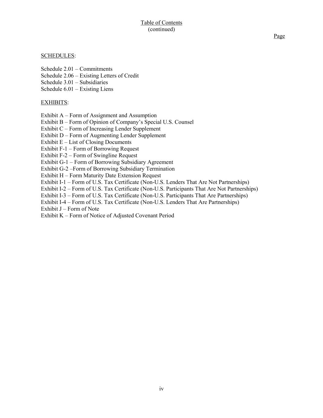 Table of Contents (continued) Page iv SCHEDULES: Schedule 2.01 – Commitments Schedule 2.06 – Existing Letters of Credit Schedule 3.01 – Subsidiaries Schedule 6.01 – Existing Liens EXHIBITS: Exhibit A – Form of Assignment and Assumption Exhibit B – Form of Opinion of Company’s Special U.S. Counsel Exhibit C – Form of Increasing Lender Supplement Exhibit D – Form of Augmenting Lender Supplement Exhibit E – List of Closing Documents Exhibit F-1 – Form of Borrowing Request Exhibit F-2 – Form of Swingline Request Exhibit G-1 – Form of Borrowing Subsidiary Agreement Exhibit G-2 –Form of Borrowing Subsidiary Termination Exhibit H – Form Maturity Date Extension Request Exhibit I-1 – Form of U.S. Tax Certificate (Non-U.S. Lenders That Are Not Partnerships) Exhibit I-2 – Form of U.S. Tax Certificate (Non-U.S. Participants That Are Not Partnerships) Exhibit I-3 – Form of U.S. Tax Certificate (Non-U.S. Participants That Are Partnerships) Exhibit I-4 – Form of U.S. Tax Certificate (Non-U.S. Lenders That Are Partnerships) Exhibit J – Form of Note Exhibit K – Form of Notice of Adjusted Covenant Period