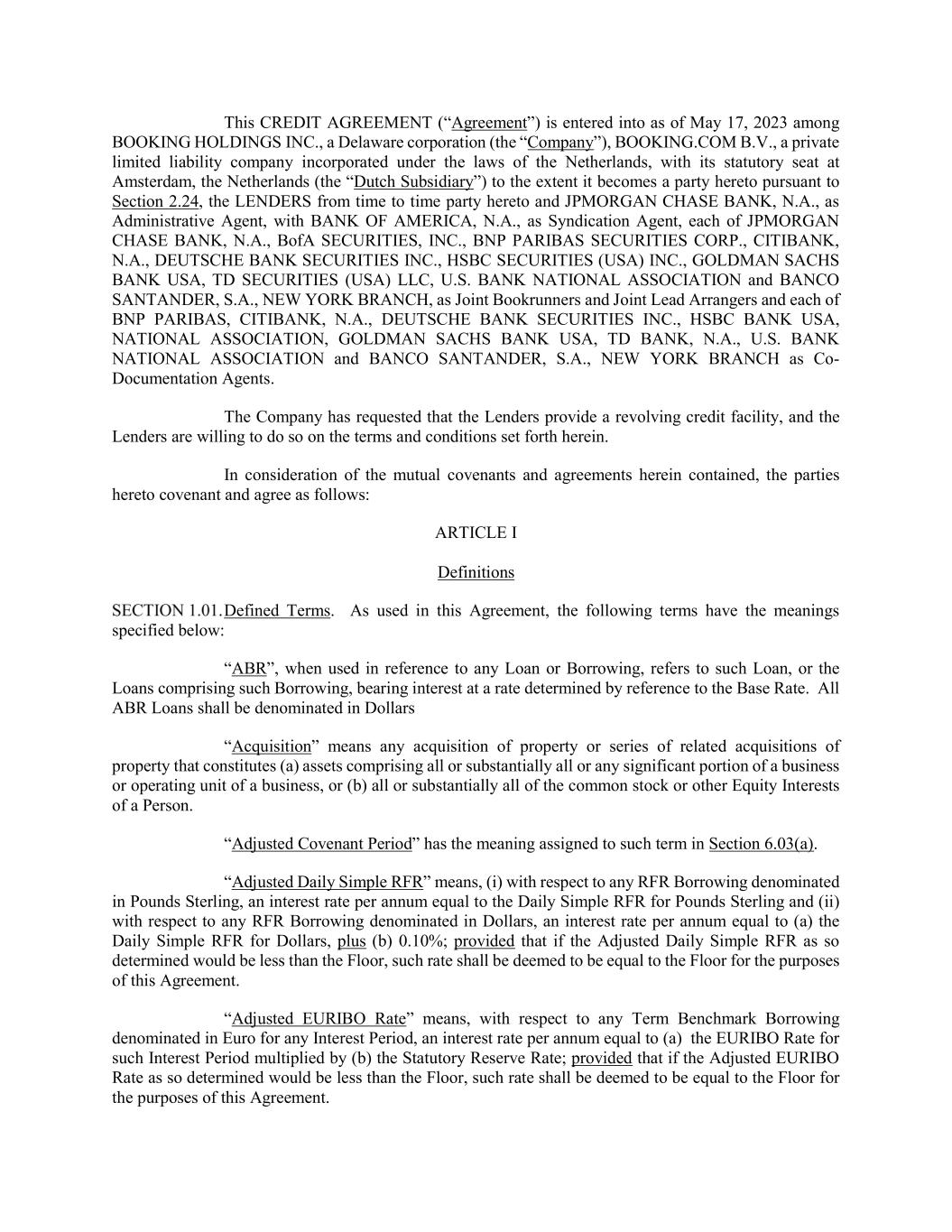 This CREDIT AGREEMENT (“Agreement”) is entered into as of May 17, 2023 among BOOKING HOLDINGS INC., a Delaware corporation (the “Company”), BOOKING.COM B.V., a private limited liability company incorporated under the laws of the Netherlands, with its statutory seat at Amsterdam, the Netherlands (the “Dutch Subsidiary”) to the extent it becomes a party hereto pursuant to Section 2.24, the LENDERS from time to time party hereto and JPMORGAN CHASE BANK, N.A., as Administrative Agent, with BANK OF AMERICA, N.A., as Syndication Agent, each of JPMORGAN CHASE BANK, N.A., BofA SECURITIES, INC., BNP PARIBAS SECURITIES CORP., CITIBANK, N.A., DEUTSCHE BANK SECURITIES INC., HSBC SECURITIES (USA) INC., GOLDMAN SACHS BANK USA, TD SECURITIES (USA) LLC, U.S. BANK NATIONAL ASSOCIATION and BANCO SANTANDER, S.A., NEW YORK BRANCH, as Joint Bookrunners and Joint Lead Arrangers and each of BNP PARIBAS, CITIBANK, N.A., DEUTSCHE BANK SECURITIES INC., HSBC BANK USA, NATIONAL ASSOCIATION, GOLDMAN SACHS BANK USA, TD BANK, N.A., U.S. BANK NATIONAL ASSOCIATION and BANCO SANTANDER, S.A., NEW YORK BRANCH as Co- Documentation Agents. The Company has requested that the Lenders provide a revolving credit facility, and the Lenders are willing to do so on the terms and conditions set forth herein. In consideration of the mutual covenants and agreements herein contained, the parties hereto covenant and agree as follows: ARTICLE I Definitions Defined Terms. As used in this Agreement, the following terms have the meanings specified below: “ABR”, when used in reference to any Loan or Borrowing, refers to such Loan, or the Loans comprising such Borrowing, bearing interest at a rate determined by reference to the Base Rate. All ABR Loans shall be denominated in Dollars “Acquisition” means any acquisition of property or series of related acquisitions of property that constitutes (a) assets comprising all or substantially all or any significant portion of a business or operating unit of a business, or (b) all or substantially all of the common stock or other Equity Interests of a Person. “Adjusted Covenant Period” has the meaning assigned to such term in Section 6.03(a). “Adjusted Daily Simple RFR” means, (i) with respect to any RFR Borrowing denominated in Pounds Sterling, an interest rate per annum equal to the Daily Simple RFR for Pounds Sterling and (ii) with respect to any RFR Borrowing denominated in Dollars, an interest rate per annum equal to (a) the Daily Simple RFR for Dollars, plus (b) 0.10%; provided that if the Adjusted Daily Simple RFR as so determined would be less than the Floor, such rate shall be deemed to be equal to the Floor for the purposes of this Agreement. “Adjusted EURIBO Rate” means, with respect to any Term Benchmark Borrowing denominated in Euro for any Interest Period, an interest rate per annum equal to (a) the EURIBO Rate for such Interest Period multiplied by (b) the Statutory Reserve Rate; provided that if the Adjusted EURIBO Rate as so determined would be less than the Floor, such rate shall be deemed to be equal to the Floor for the purposes of this Agreement.