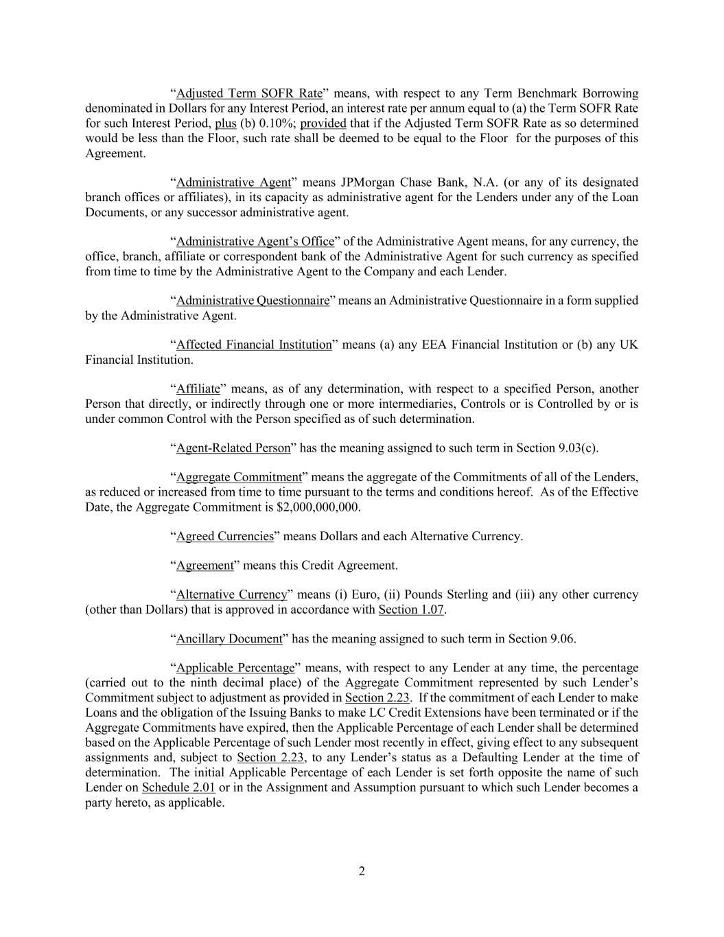 2 “Adjusted Term SOFR Rate” means, with respect to any Term Benchmark Borrowing denominated in Dollars for any Interest Period, an interest rate per annum equal to (a) the Term SOFR Rate for such Interest Period, plus (b) 0.10%; provided that if the Adjusted Term SOFR Rate as so determined would be less than the Floor, such rate shall be deemed to be equal to the Floor for the purposes of this Agreement. “Administrative Agent” means JPMorgan Chase Bank, N.A. (or any of its designated branch offices or affiliates), in its capacity as administrative agent for the Lenders under any of the Loan Documents, or any successor administrative agent. “Administrative Agent’s Office” of the Administrative Agent means, for any currency, the office, branch, affiliate or correspondent bank of the Administrative Agent for such currency as specified from time to time by the Administrative Agent to the Company and each Lender. “Administrative Questionnaire” means an Administrative Questionnaire in a form supplied by the Administrative Agent. “Affected Financial Institution” means (a) any EEA Financial Institution or (b) any UK Financial Institution. “Affiliate” means, as of any determination, with respect to a specified Person, another Person that directly, or indirectly through one or more intermediaries, Controls or is Controlled by or is under common Control with the Person specified as of such determination. “Agent-Related Person” has the meaning assigned to such term in Section 9.03(c). “Aggregate Commitment” means the aggregate of the Commitments of all of the Lenders, as reduced or increased from time to time pursuant to the terms and conditions hereof. As of the Effective Date, the Aggregate Commitment is $2,000,000,000. “Agreed Currencies” means Dollars and each Alternative Currency. “Agreement” means this Credit Agreement. “Alternative Currency” means (i) Euro, (ii) Pounds Sterling and (iii) any other currency (other than Dollars) that is approved in accordance with Section 1.07. “Ancillary Document” has the meaning assigned to such term in Section 9.06. “Applicable Percentage” means, with respect to any Lender at any time, the percentage (carried out to the ninth decimal place) of the Aggregate Commitment represented by such Lender’s Commitment subject to adjustment as provided in Section 2.23. If the commitment of each Lender to make Loans and the obligation of the Issuing Banks to make LC Credit Extensions have been terminated or if the Aggregate Commitments have expired, then the Applicable Percentage of each Lender shall be determined based on the Applicable Percentage of such Lender most recently in effect, giving effect to any subsequent assignments and, subject to Section 2.23, to any Lender’s status as a Defaulting Lender at the time of determination. The initial Applicable Percentage of each Lender is set forth opposite the name of such Lender on Schedule 2.01 or in the Assignment and Assumption pursuant to which such Lender becomes a party hereto, as applicable.