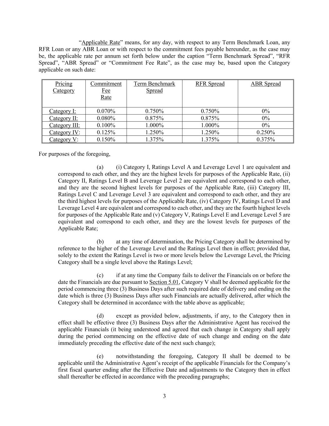 3 “Applicable Rate” means, for any day, with respect to any Term Benchmark Loan, any RFR Loan or any ABR Loan or with respect to the commitment fees payable hereunder, as the case may be, the applicable rate per annum set forth below under the caption “Term Benchmark Spread”, “RFR Spread”, “ABR Spread” or “Commitment Fee Rate”, as the case may be, based upon the Category applicable on such date: Pricing Category Commitment Fee Rate Term Benchmark Spread RFR Spread ABR Spread Category I: 0.070% 0.750% 0.750% 0% Category II: 0.080% 0.875% 0.875% 0% Category III: 0.100% 1.000% 1.000% 0% Category IV: 0.125% 1.250% 1.250% 0.250% Category V: 0.150% 1.375% 1.375% 0.375% For purposes of the foregoing, (a) (i) Category I, Ratings Level A and Leverage Level 1 are equivalent and correspond to each other, and they are the highest levels for purposes of the Applicable Rate, (ii) Category II, Ratings Level B and Leverage Level 2 are equivalent and correspond to each other, and they are the second highest levels for purposes of the Applicable Rate, (iii) Category III, Ratings Level C and Leverage Level 3 are equivalent and correspond to each other, and they are the third highest levels for purposes of the Applicable Rate, (iv) Category IV, Ratings Level D and Leverage Level 4 are equivalent and correspond to each other, and they are the fourth highest levels for purposes of the Applicable Rate and (v) Category V, Ratings Level E and Leverage Level 5 are equivalent and correspond to each other, and they are the lowest levels for purposes of the Applicable Rate; (b) at any time of determination, the Pricing Category shall be determined by reference to the higher of the Leverage Level and the Ratings Level then in effect; provided that, solely to the extent the Ratings Level is two or more levels below the Leverage Level, the Pricing Category shall be a single level above the Ratings Level; (c) if at any time the Company fails to deliver the Financials on or before the date the Financials are due pursuant to Section 5.01, Category V shall be deemed applicable for the period commencing three (3) Business Days after such required date of delivery and ending on the date which is three (3) Business Days after such Financials are actually delivered, after which the Category shall be determined in accordance with the table above as applicable; (d) except as provided below, adjustments, if any, to the Category then in effect shall be effective three (3) Business Days after the Administrative Agent has received the applicable Financials (it being understood and agreed that each change in Category shall apply during the period commencing on the effective date of such change and ending on the date immediately preceding the effective date of the next such change); (e) notwithstanding the foregoing, Category II shall be deemed to be applicable until the Administrative Agent’s receipt of the applicable Financials for the Company’s first fiscal quarter ending after the Effective Date and adjustments to the Category then in effect shall thereafter be effected in accordance with the preceding paragraphs;