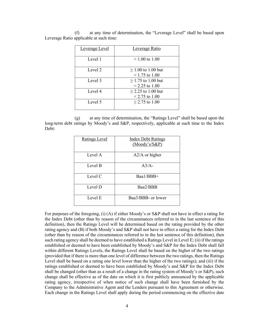 4 (f) at any time of determination, the “Leverage Level” shall be based upon Leverage Ratio applicable at such time: Leverage Level Leverage Ratio Level 1 < 1.00 to 1.00 Level 2 ≥ 1.00 to 1.00 but < 1.75 to 1.00 Level 3 ≥ 1.75 to 1.00 but < 2.25 to 1.00 Level 4 ≥ 2.25 to 1.00 but < 2.75 to 1.00 Level 5 ≥ 2.75 to 1.00 (g) at any time of determination, the “Ratings Level” shall be based upon the long-term debt ratings by Moody’s and S&P, respectively, applicable at such time to the Index Debt: Ratings Level Index Debt Ratings (Moody’s/S&P) Level A A2/A or higher Level B A3/A- Level C Baa1/BBB+ Level D Baa2/BBB Level E Baa3/BBB- or lower For purposes of the foregoing, (i) (A) if either Moody’s or S&P shall not have in effect a rating for the Index Debt (other than by reason of the circumstances referred to in the last sentence of this definition), then the Ratings Level will be determined based on the rating provided by the other rating agency and (B) if both Moody’s and S&P shall not have in effect a rating for the Index Debt (other than by reason of the circumstances referred to in the last sentence of this definition), then such rating agency shall be deemed to have established a Ratings Level in Level E; (ii) if the ratings established or deemed to have been established by Moody’s and S&P for the Index Debt shall fall within different Ratings Levels, the Ratings Level shall be based on the higher of the two ratings (provided that if there is more than one level of difference between the two ratings, then the Ratings Level shall be based on a rating one level lower than the higher of the two ratings); and (iii) if the ratings established or deemed to have been established by Moody’s and S&P for the Index Debt shall be changed (other than as a result of a change in the rating system of Moody’s or S&P), such change shall be effective as of the date on which it is first publicly announced by the applicable rating agency, irrespective of when notice of such change shall have been furnished by the Company to the Administrative Agent and the Lenders pursuant to this Agreement or otherwise. Each change in the Ratings Level shall apply during the period commencing on the effective date