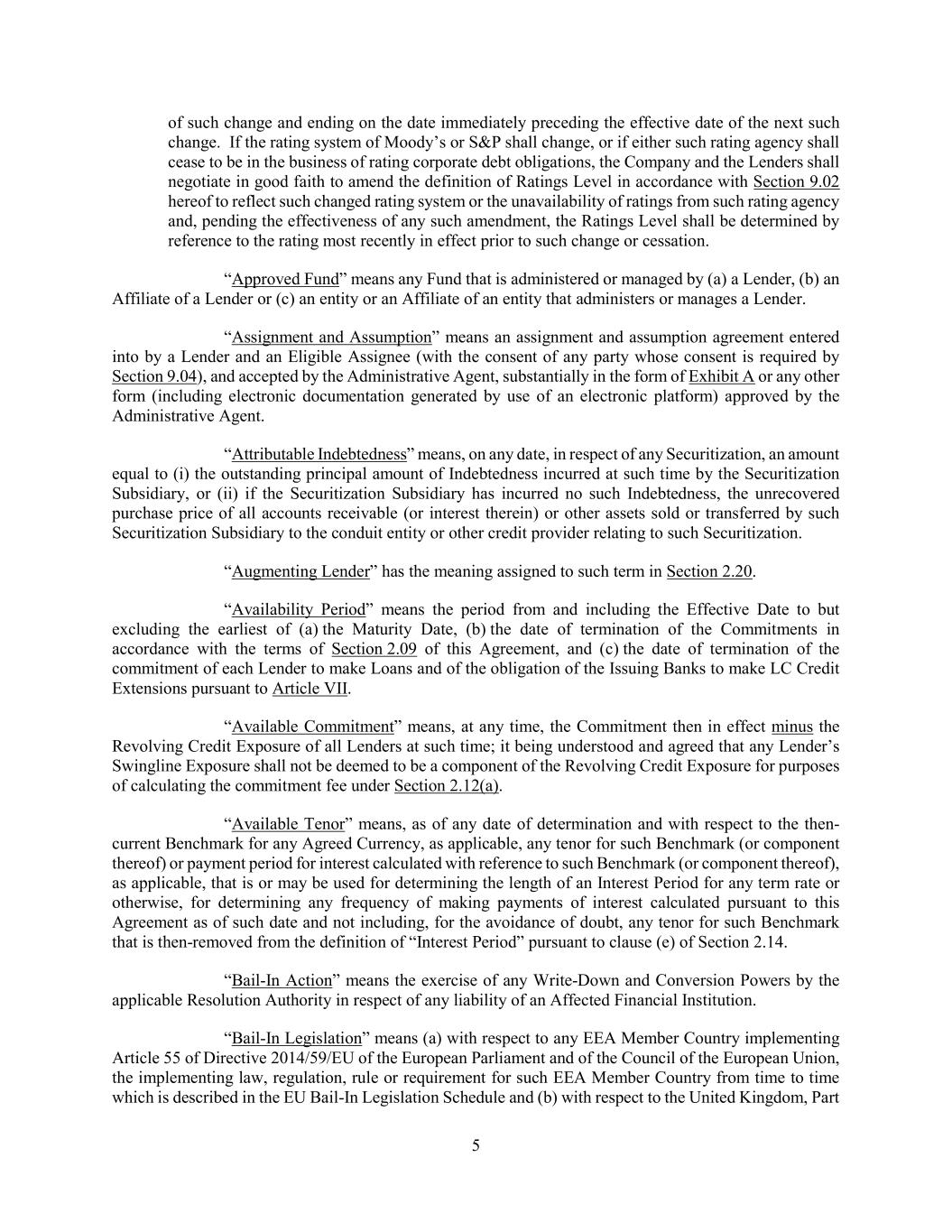 5 of such change and ending on the date immediately preceding the effective date of the next such change. If the rating system of Moody’s or S&P shall change, or if either such rating agency shall cease to be in the business of rating corporate debt obligations, the Company and the Lenders shall negotiate in good faith to amend the definition of Ratings Level in accordance with Section 9.02 hereof to reflect such changed rating system or the unavailability of ratings from such rating agency and, pending the effectiveness of any such amendment, the Ratings Level shall be determined by reference to the rating most recently in effect prior to such change or cessation. “Approved Fund” means any Fund that is administered or managed by (a) a Lender, (b) an Affiliate of a Lender or (c) an entity or an Affiliate of an entity that administers or manages a Lender. “Assignment and Assumption” means an assignment and assumption agreement entered into by a Lender and an Eligible Assignee (with the consent of any party whose consent is required by Section 9.04), and accepted by the Administrative Agent, substantially in the form of Exhibit A or any other form (including electronic documentation generated by use of an electronic platform) approved by the Administrative Agent. “Attributable Indebtedness” means, on any date, in respect of any Securitization, an amount equal to (i) the outstanding principal amount of Indebtedness incurred at such time by the Securitization Subsidiary, or (ii) if the Securitization Subsidiary has incurred no such Indebtedness, the unrecovered purchase price of all accounts receivable (or interest therein) or other assets sold or transferred by such Securitization Subsidiary to the conduit entity or other credit provider relating to such Securitization. “Augmenting Lender” has the meaning assigned to such term in Section 2.20. “Availability Period” means the period from and including the Effective Date to but excluding the earliest of (a) the Maturity Date, (b) the date of termination of the Commitments in accordance with the terms of Section 2.09 of this Agreement, and (c) the date of termination of the commitment of each Lender to make Loans and of the obligation of the Issuing Banks to make LC Credit Extensions pursuant to Article VII. “Available Commitment” means, at any time, the Commitment then in effect minus the Revolving Credit Exposure of all Lenders at such time; it being understood and agreed that any Lender’s Swingline Exposure shall not be deemed to be a component of the Revolving Credit Exposure for purposes of calculating the commitment fee under Section 2.12(a). “Available Tenor” means, as of any date of determination and with respect to the then- current Benchmark for any Agreed Currency, as applicable, any tenor for such Benchmark (or component thereof) or payment period for interest calculated with reference to such Benchmark (or component thereof), as applicable, that is or may be used for determining the length of an Interest Period for any term rate or otherwise, for determining any frequency of making payments of interest calculated pursuant to this Agreement as of such date and not including, for the avoidance of doubt, any tenor for such Benchmark that is then-removed from the definition of “Interest Period” pursuant to clause (e) of Section 2.14. “Bail-In Action” means the exercise of any Write-Down and Conversion Powers by the applicable Resolution Authority in respect of any liability of an Affected Financial Institution. “Bail-In Legislation” means (a) with respect to any EEA Member Country implementing Article 55 of Directive 2014/59/EU of the European Parliament and of the Council of the European Union, the implementing law, regulation, rule or requirement for such EEA Member Country from time to time which is described in the EU Bail-In Legislation Schedule and (b) with respect to the United Kingdom, Part